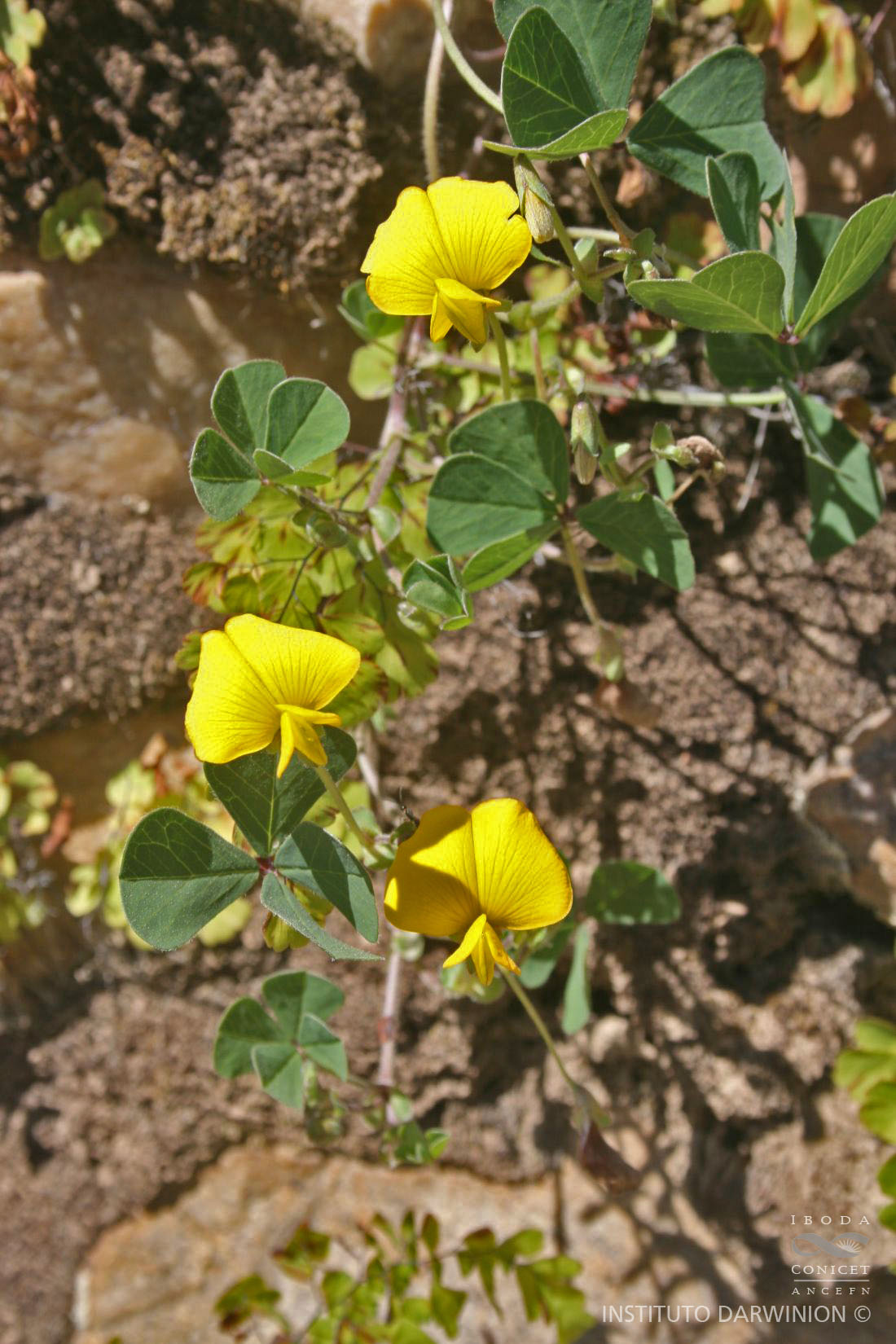 Plantas postradas, tallos con indumento de pelos blanquecinos débiles, retrorsos. Hojas digitado-tetrafolioladas. Estípulas orbiculares 3 mm diám., sésiles, ciliadas. Folíolos 4 por hoja, 8-10 mm long. x 8 mm lat., obovados, cuneados en la base, redondeados en el ápice; hipofilo y epifilo con pelos blancos, ralos, hipofilo además con glándulas sésiles. Inflorescencia en racimos unifloros; pedúnculos ca. 4,5 cm long., bracteados, con el mismo indumento que el tallo. Flores amarillas, 13 mm long.; cáliz campanulado, tubo 4 mm long. 5 dientes, 2 superiores unidos redondeados, 2 laterales, 2 mm long., el inferior mayor, 3 mm long.; pétalos unguiculados; estandarte orbicular 13 mm long, levemente emarginado; alas oblongas 11 mm long.; quilla levemente incurva. Fruto 2-3-articulado, artejos orbiculares-ovados, con apéndices pubérulos.