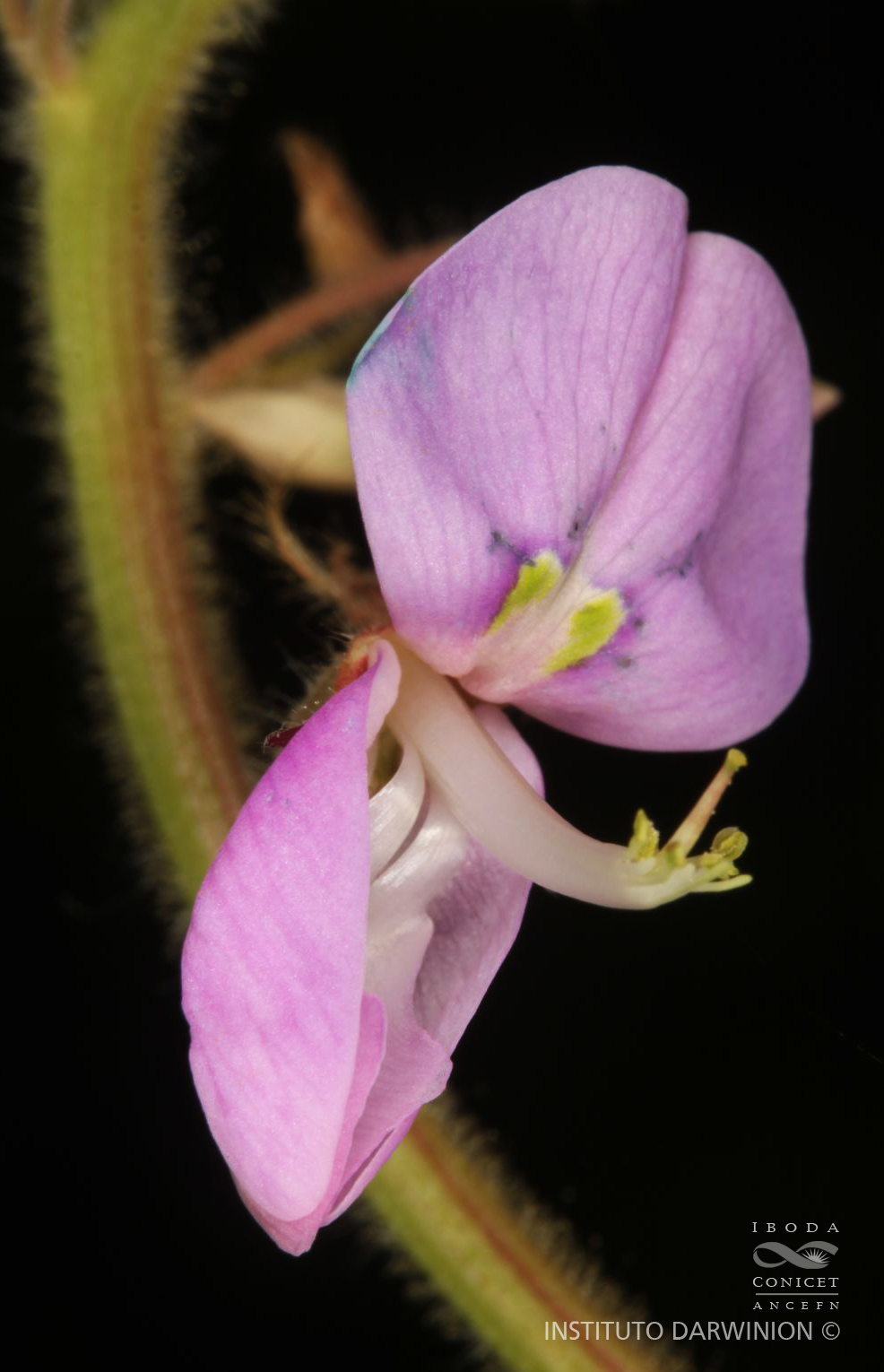 Planta con ramas postradas o decumbentes, ca. 1 m long., surcadas, pelos hialinos recurvos, además pelos uncinulados breves. Hojas trifoliadas. Estípulas 4,5-7 mm long., libres, lanceoladas, prontamente caducas. Pecíolos 9-45 mm long., con el indumento de las ramas, estipelas subuladas 1-1,5 mm long. Folíolos laterales 10-50 mm long. x 5,5-50 mm lat., elípticos, asimétricos, epifilo con pelos adpresos y pelos uncinulados en los nervios; hipofilo con pelos incurvos, hialinos, de densidad variable, más densos en los nervios; el terminal 9,5-49 mm long. x 15-50 mm lat., ovado a romboidal, con epifilo e hipofilo como en los folíolos laterales. Racimos terminales o axilares laxos, 15-20 cm long. Flores ca. 10 mm long., geminadas, con una bráctea basal lanceolada, amarillenta, ciliada y pelos aplicados hialinos, muy prontamente caducas. Cáliz 4 mm long., campanulado, tubo 4 mm long.; dientes de 2 mm long., el inferior mayor y muy agudo, los restantes lanceolados. Pétalos violáceos, unguiculados, estandarte 10 mm long., lámina obovada, 8 mm long., uña 2 mm long.; alas 9,5 mm long. x 1,5 mm lat. , oblongas, uña 1 mm long.; quilla 9 mm long., levemente falcada, uña 2 mm long. Fruto con 4-8-articulado, artejos 3-4,5 mm long. x 2,5 mm lat., redondeados a ovales, castaños, con pelos uncinulados muy densos.