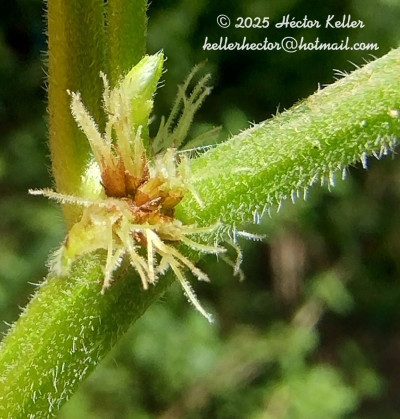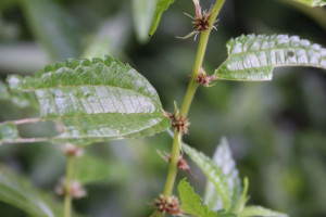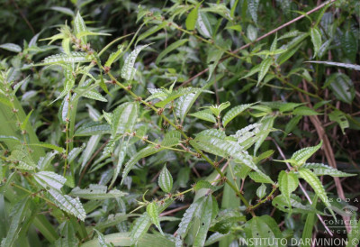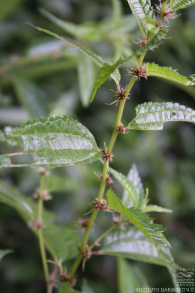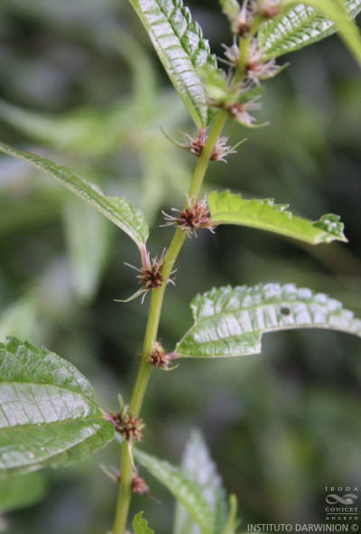 Sufrútices hasta de 2 m de alto; tallos ligeramente estriados, estrigosos, hirsutos o pubescentes. Hojas con pecíolos de 1-7 cm de largo, pubescentes; estípulas ovadas, de 5-8 mm de largo; lámina elíptica a elíptico-lanceolada, de 2,5-13,5 × 1-6 cm, base cuneada, obtusa o redondeada, el margen serrado en la mitad superior. Glomérulos de 0,9-1,1 cm de diámetro; brácteas obovadas, de 1-2,5 mm de largo. Flores estaminadas subsésiles, tépalos con lóbulos apiculados, con tricomas simples y uncinados en el ápice. Flores pistiladas con estigma de 2-4,2 mm de largo. Aquenio de 0,7-1,2 mm de largo, pericarpo verrucoso.