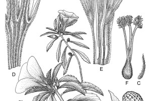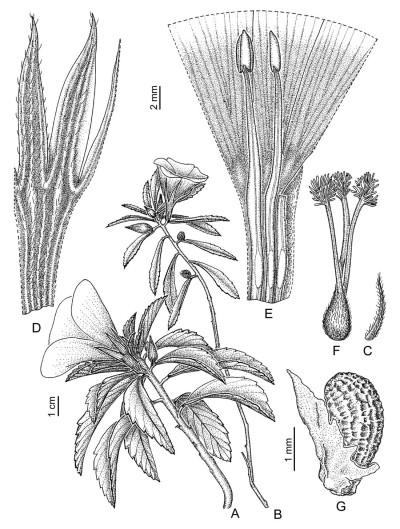 Hierba perenne, de 10-60 cm de alto, simple o ramificada, tallos con pelos simples, estrigosos o con pelos largos, antrorsos y cortos, crespos; yemas axilares seriales 2. Hojas herbáceas, sin estípulas; pecíolo semicilíndrico, de 1,5-7 mm de largo; nectarios 2 en la unión del pecíolo y la lámina, a veces desplazados sobre el margen de la lámina, discoideos, con borde pubérulo; lámina angustiovada, obovada, oblonga o elíptica, de 11-73 × 3-24 mm, cara adaxial con pelos largos y cortos, cara abaxial con venas prominentes, pilosas, margen aserrado o serrulado, ápice generalmente agudo. Flores solitarias, epifilas, heterostilas; pedúnculo de 4-9 mm de largo, adnato al pecíolo, a veces la parte apical libre; pedicelo ausente; profilos 2, subulados, de 2,5-6 mm de largo, insertos en la base del cáliz, opuestos; cáliz de 19-35 mm de largo, tubo de 7-15 mm de largo, cara externa con pelos largos y cortos; lóbulos triangulares o lanceolados, ápice agudo o mucronado; corola campanulada, más larga que el cáliz; pétalos obovados, de 13-50 × 8-26 mm, blancos o liláceos, base con mácula morada de borde superior esfumado; filamentos estaminales blanquecinos, complanado-subulados, insertos en la base del tubo floral, de 10-15 mm de largo en flores longistilas y de 14-21 mm de largo en las brevistilas, porción basal soldada por los bordes a la uña de los pétalos, formando bolsillos nectaríferos; anteras sub-basifijas, angustiovadas, de 3-4 mm de largo, amarillas; ovario ovoide, de 2-4 mm de largo, densamente estrigoso; estilos filiformes, en flores longistilas erectos, de 10-17 mm de largo, en flores brevistilas recurvos, de 6,5-12 mm de largo; estigmas amarillos, penicilados, de 1,5-3,5 mm de largo. Frutos globosos u ovoides, de 4-11 mm de diámetro, cara externa tuberculada y estrigosa, cara interna glabra y lisa. Semillas obovoides, de 2,2-3 × 0,9-1,3 mm, negruzcas a la madurez, reticuladas, aréolas rectangulares; arilo unilateral, tan largo como la semilla.