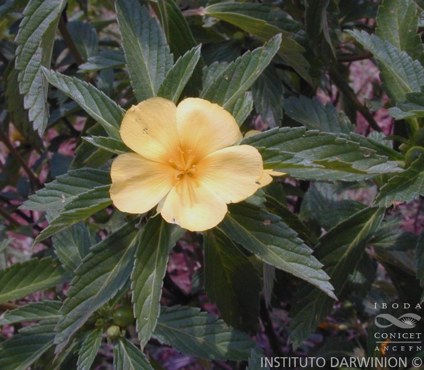 Sufrútice de 0,20-1,50 m de alto, ramificado, con pelos simples; tallos jóvenes estrigosos o con pelos largos, antrorsos, cortos, crespos; yemas axilares seriales 2-3, ramas seriales desarrolladas en la parte inferior de la planta. Hojas con estípulas de 0,1-1 mm de largo; pecíolo de 2-18 mm de largo; nectarios 2, en la unión de pecíolo y lámina, a veces desplazados sobre el margen de la lámina, discoideos, borde pubérulo; lámina lanceolada, elíptica u ovada, raramente obovada, de 1,5-9 × 0,6-4 cm, haz con pelos largos antrorsos, envés con pelos más densos y pelos glandulares cortos, cilíndricos; margen simple o doblemente aserrado-crenado; ápice generalmente agudo. Flores solitarias, epifilas, homostilas, autocompatibles; pedúnculo de 2-14 mm de largo, adnato al pecíolo; pedicelo ausente; profilos 2, subulados, de 4,5-13 mm de largo, insertos en la base del cáliz, opuestos; cáliz de 11-15 mm de largo, tubo de 3-5,5 mm de largo, cara externa con pelos largos, adpresos y otros cortos, erectos; lóbulos lanceolados, ápice mucronado; corola rotácea, más larga que el cáliz; pétalos obovados, de 13-27 × 7-21 mm, de color amarillo pálido a intenso, raramente blanco; filamentos estaminales amarillentos, complanado-subulados, de 7-12 mm de largo, base adnata 1,5-2 mm al tubo floral, soldados por los bordes a la uña de los pétalos hasta la garganta formando bolsillos nectaríferos; anteras angustiovoideas, sub-basifijas, anaranjadas, de 2,6-4,5 mm de largo; ovario ovoide, de 1,8-3 mm de largo, estrigoso; estilos amarillos, de 7-13 mm de largo, con pelos en la porción central; estigmas penicilados amarillos, de 1-2,5 mm de largo. Frutos globosos o latiovoides, de 4,5-10 mm de diámetro, cara externa tuberculada, con pelos simples largos y cortos, cara interna glabra y reticulada. Semillas claviformes, de 2-3 × 0,8-1,2 mm, ligeramente curvadas, negruzcas a la madurez, reticuladas, aréolas grandes; arilo unilateral, rasgado, más corto o más largo que la semilla.