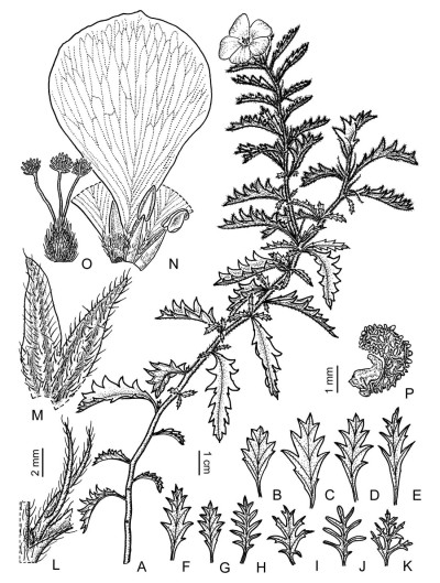 Hierba hemicriptófita de 5-37 cm de alto, simple o ramificada, tallos con pelos simples, largos, adpresos y otros cortos y crespos. Hojas con estípulas ausentes o rudimentarias, pecíolo de 0,5-8 mm de largo, indumento como el del tallo; lámina pinnatifida a pinnatisecta, de 12-58 × 6-28 mm, incisión de la hemilámina 37-95%, con 2-6 lóbulos a cada lado, lanceolados, triangulares o subulados, haz con pelos simples, largos, adpresos y a veces pelos cortos erectos. Flores heterostilas, pedúnculo de 2,5-11 mm de largo, soldado 0-8 mm al pecíolo, indumento como el del tallo; profilos 2, subulados, de 6-12 mm de largo, insertos en el ápice del pedúnculo; pedicelo de 1-4 mm de largo; cáliz de 6-12 mm de largo, cara externa con pelos simples, largos, antrorsos, especialmente sobre las venas; tubo de 1,5-3,5 mm de largo; lóbulos con márgenes internos membranáceos y ápice agudo; corola más larga que el cáliz; pétalos amarillos, salmón, rosa pálido, liláceos o anaranjadorojizos, generalmente con mácula basal oscura, a veces con venas violáceas, de 10-18 × 6-14 mm; filamentos estaminales subulados, blanquecinos o rosados, con pelos simples, de 3-5 mm de largo en flores longistilas y de 6-8 mm de largo en las brevistilas; anteras dorsifijas, de contorno angustiovado, obtusas, de 1,2-2,2 mm de largo; ovario ovoide, hirsuto, de 1,5-2 mm de largo; estilos cilíndricos, glabros, rosados, rojizos o amarillos, de 4-6 mm de largo en flores longistilas y de 1,5-2 mm de largo en las brevistilas; estigmas lobulados a multífidos, generalmente amarillos, de 0,4-1 mm de largo. Frutos ovoides, de 4,5-11 mm de largo, cara externa granulosa, pilosa, cara interna glabra, lustrosa, lisa o impreso-reticulada. Semillas virguliformes, de 3-4,2 × 0,8-1,3 mm, negruzcas a la madurez, crestadas, crestas irregulares, longitudinales y transversales; arilo unilateral, de 1,2-2 mm de largo.