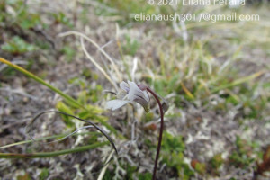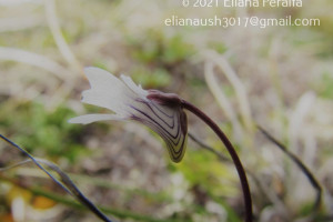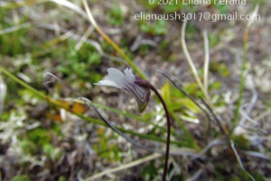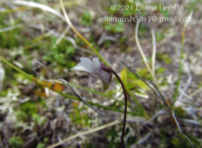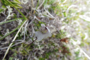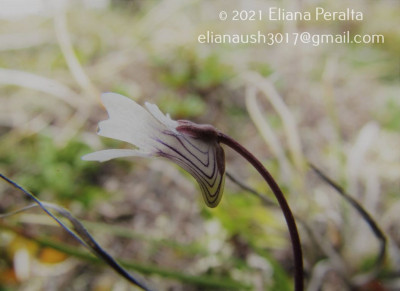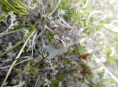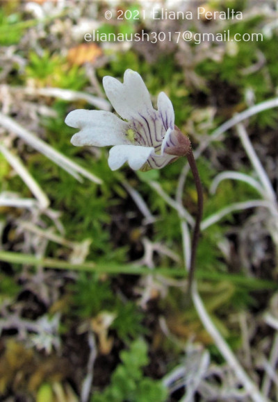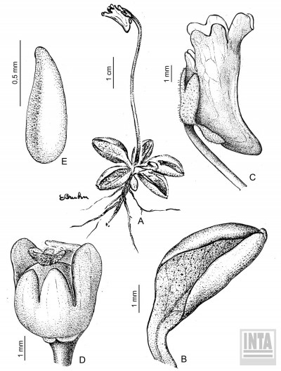 Hierbas perennes, de 5-10 cm de alto. Hojas ovadas hasta orbiculares, de 18-25 × 10-15 mm, unguiculadas, obtusas, levemente emarginadas, márgenes involutos, cara adaxial con pelos glandulares sésiles y estipitados de color verde amarillento brillante, cara abaxial glabra. Escapos florales 1-2, 1-floros, de 2-10 cm de largo, ebracteados y con algunos pelos glandulares. Flores con cáliz 2-labiado, labio superior 3-lobado, lóbulos obtusos, subcuadrangulares, el inferior 2-lobado; corola de 7-11 mm de largo, glabra, 2-labiada, blanca con guías exteriores violáceas, labio superior 2- lobado, el inferior 3-lobado, lóbulos emarginados; espolón de 2 × 1-2 mm, obtuso, algo curvo y descendente, con algunos pelos glandulares de color verde-amarillento, paladar ligeramente pronunciado con pubescencia amarilla; estambres de 1-2,3 mm de largo, filamentos estaminales semialados en la mitad inferior; ovario esférico, estilo cilíndrico muy corto, estigma 2-lamelado.