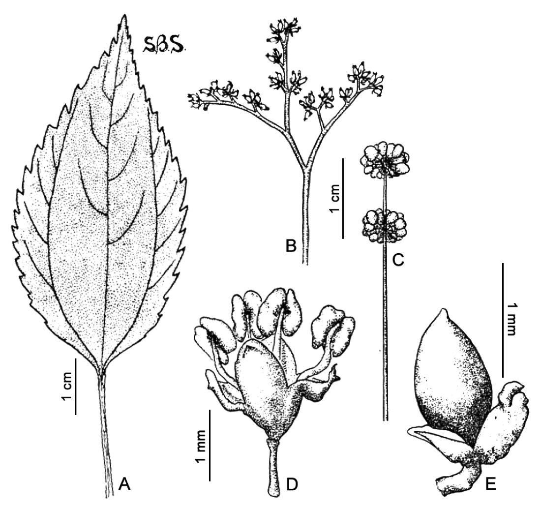 A Hoja. B. Inflorescencia. C. Inflorescencia, detalle. D. Flor estaminada. E. Flor femenina fructificada.