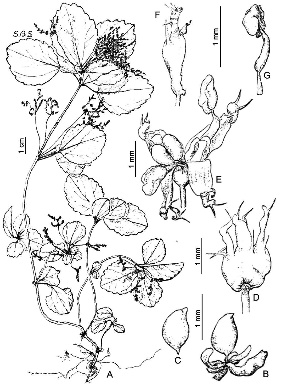 A. Planta. B. Flor pistilada y fruto. C. Semilla. D-E. Flor estaminada. F. Perigonio de la flor estaminada, corte longitudinal mostrando el apéndice liguliforme. G. Estambre.