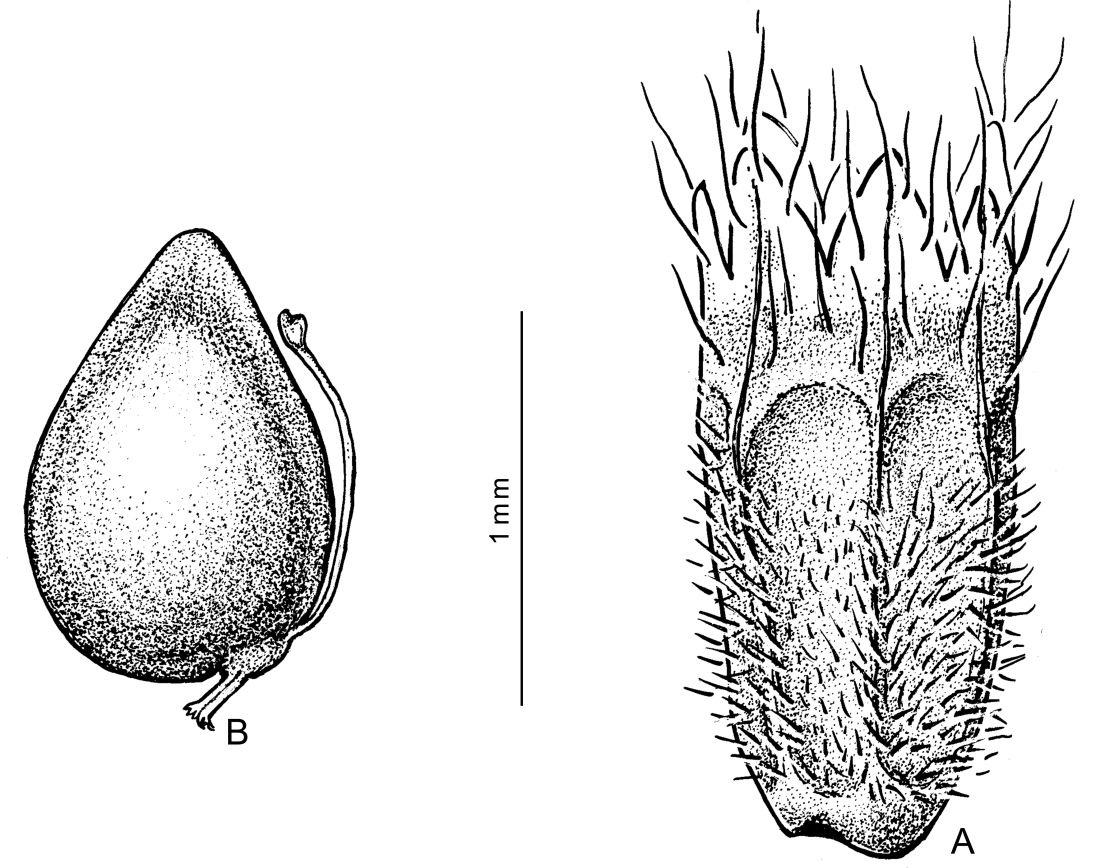 Hierbas anuales, de 1-6 cm de alto, postradas, en ocasiones erectas; tallo multicaule, en ocasiones simple; raíz pivotante, filiforme. Hojas simples con pecíolos de 0,6-0,9 cm de largo; lámina palmatipartida, en ocasiones palmatifi da, con segmentos 3(-4)-lobados, de 0,4-1 × 0,7-1,3 cm, base aguda, serícea en ambas caras. Inflorescencias en cimas glomeriformes. Flores de 1,3-1,8 mm de diámetro; receptáculo oblongo, de 1,5-2(-2,5) mm de largo, con costillas poco prominentes y tricomas erectos; sépalos deltoides u ovados, de 0,5-0,7 mm de largo; epicáliz con 1-4(-5) bractéolas erectas. Cupela de contorno oblongo, de 1,5-1,9 mm de largo.
