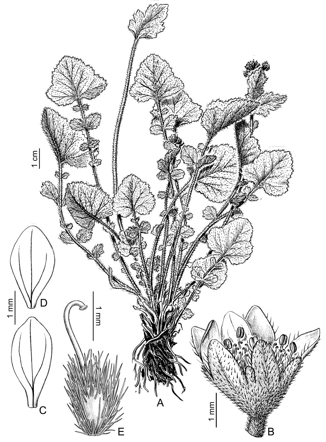 A. Planta. B. Flor, vista lateral. C & D. Pétalos, cara dorsal. E. Aquenio.
