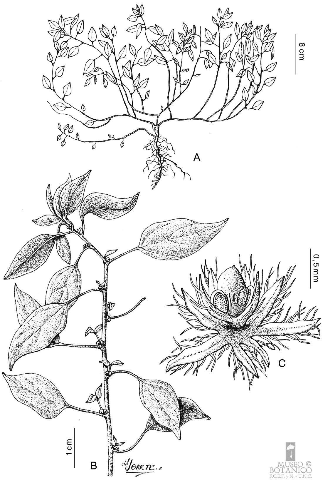 A. Planta. B. Rama florífera. C. Detalle de nudo florífero (de Decolatti s.n., CORD 510).