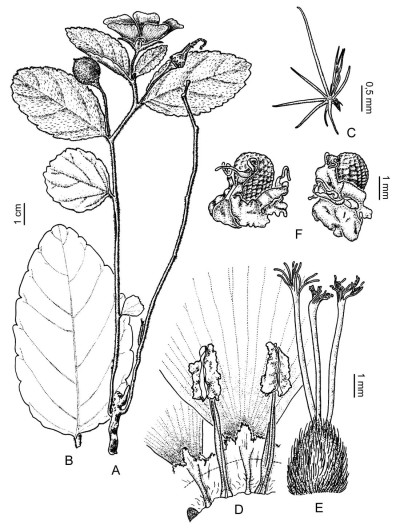 Hierba perenne, de 6-40 cm de alto, erecta o decumbente, tallos cilíndricos, rectos o sinuosos con pelos simples cortos y porrecto-estrellados ferrugíneos o amarillos, radio central de 1-2,5 mm de largo. Hojas con estípulas ausentes o muy reducidas, pecíolo de 0,5-8 mm de largo; lámina suborbicular, ovada o elíptica, de 0,9-10 × 0,9-6,5 cm, haz oscura, envés claro, tomentoso, con venas principales prominentes, margen crenado o crenado-aserrado, con nectarios diminutos en las crenas. Flores solitarias, heterostilas; pedúnculo de 7-40 mm de largo; profilos lineares, de 2-7 mm de largo, o ausentes, frecuentemente alternos, a veces opuestos en la articulación; pedicelo de 4-19 mm de largo, indumento más denso que el del pedúnculo; cáliz de 10-22 mm de largo, exteriormente tomentoso, tubo calicino de 2-3 mm de largo, lóbulos ovado-lanceolados, ápice brevemente mucronado; corola de 20-37 mm de largo, pétalos blancos a liláceos, base con una mácula rojiza a purpúrea; corona rojiza a purpúrea, de 1,5-2 mm de largo, borde fimbriado; filamentos estaminales complanado-subulados, glabros, insertos en la base del tubo floral, de 4-5 mm de largo en las flores longistilas y de 7-9 mm de largo en las brevistilas; anteras de contorno angustiovado, dorso oscuro; ovario ovoide de 2-3 mm de largo, densamente cubierto de pelos estrellados, estilos cilíndricos, rojizos o purpúreos, generalmente glabros, de 6-8 mm de largo en las flores longistilas y de 1,5-2,5 mm de largo en las brevistilas, estigmas penicilados, purpúreos. Frutos suborbiculares, de 10-15 mm de diámetro, valvas ovadas con cara externa tuberculada, pilosa, cara interna lustrosa, glabra. Semillas obovoides, rectas o algo curvadas, de 2-3,5 × 1,1-1,7 mm, reticuladas; arilo circundante, lacerado, de 3-4 mm de largo.