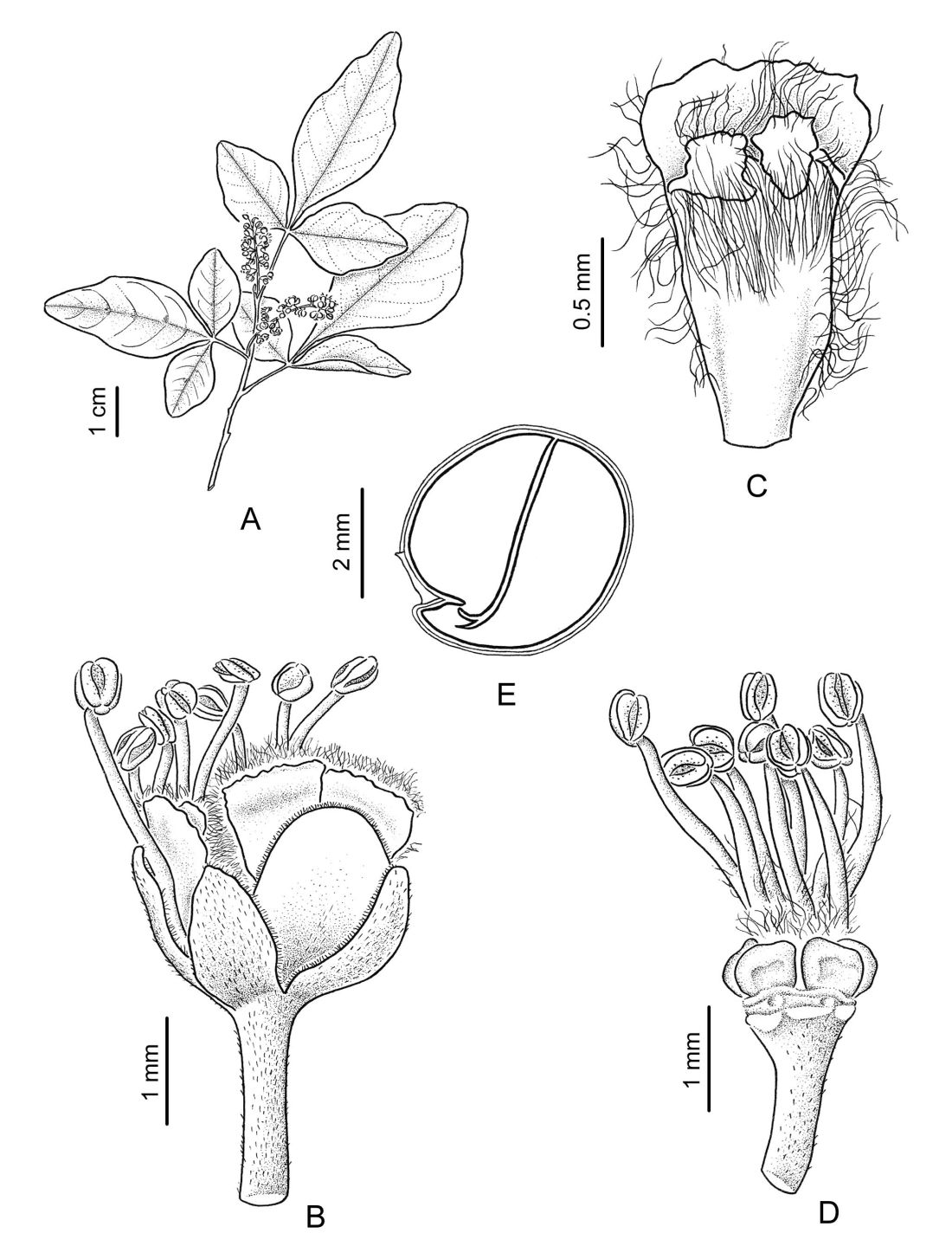 A. Rama florífera. B. Flor estaminada. C. Pétalo, cara interna. D. Flor estaminada desprovista de cáliz y corola mostrando los lobos nectaríferos. E. Semilla, corte longitudinal.