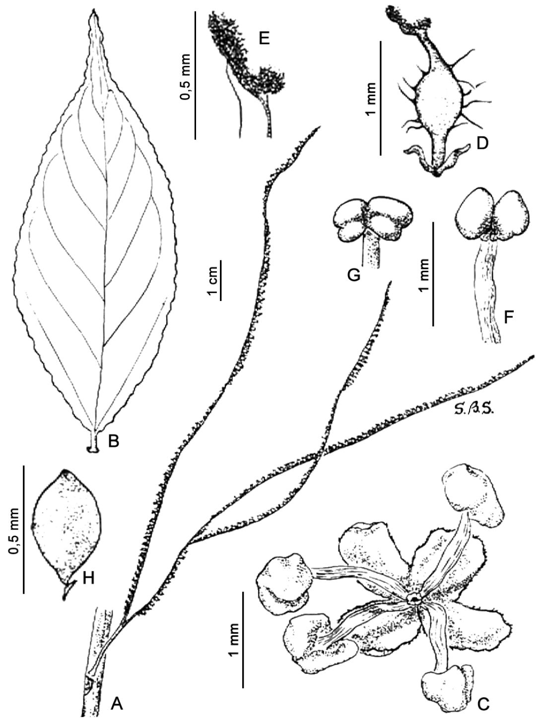 A. Inflorescencia. B. Hoja. C. Flor estaminada. D. Flor pistilada. E. Estilo, porción superior. F. Estambre. G. Porción superior del estambre, vista dorsal. H. Semilla.
