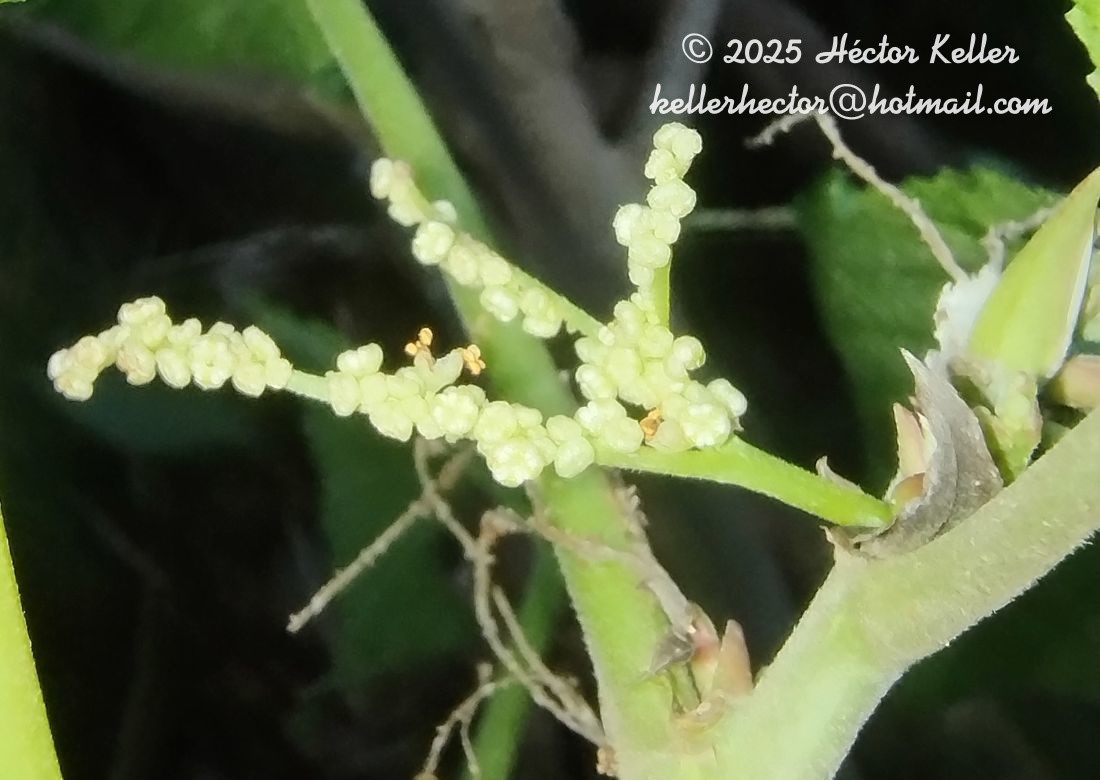 Arbustos hasta de 3 m de alto, dioicos. Hojas con pecíolos de 2-6 cm de largo; estípulas ca. 0,9 cm de largo; lámina elíptica, obovada u ovada, de 11-19 × 4-10 cm, ápice apiculado, base atenuada, redondeada o subcordada, margen crenado, cara adaxial con cistolitos formando patrones radiados, cara abaxial pubescente sobre las nervaduras. Inflorescencias 2-3 veces ramificadas, florescencias de 4-20 cm de largo. Flores estaminadas subsésiles; perigonio 4-lobado. Fruto un aquenio elipsoidal, ca. 1 mm de largo.