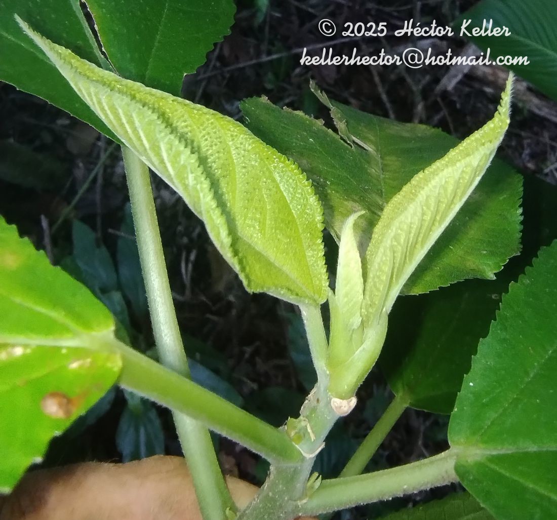 Arbustos hasta de 3 m de alto, dioicos. Hojas con pecíolos de 2-6 cm de largo; estípulas ca. 0,9 cm de largo; lámina elíptica, obovada u ovada, de 11-19 × 4-10 cm, ápice apiculado, base atenuada, redondeada o subcordada, margen crenado, cara adaxial con cistolitos formando patrones radiados, cara abaxial pubescente sobre las nervaduras. Inflorescencias 2-3 veces ramificadas, florescencias de 4-20 cm de largo. Flores estaminadas subsésiles; perigonio 4-lobado. Fruto un aquenio elipsoidal, ca. 1 mm de largo.