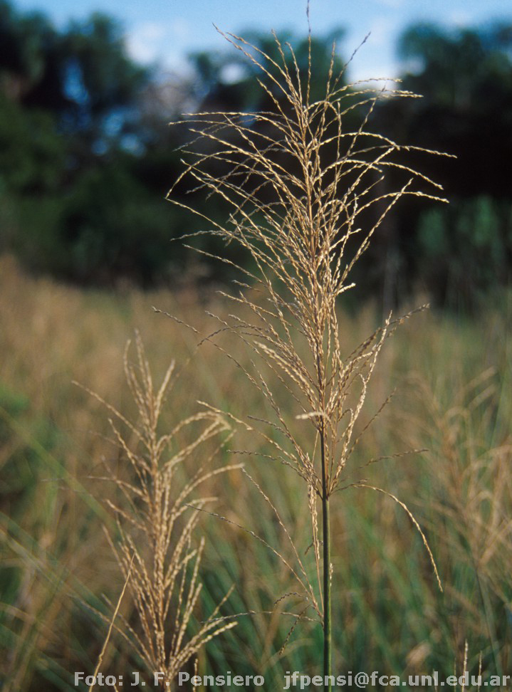 Planta perenne, erecta, cortamente rizomatosa, nodosa, de 0,80-1,80(-2) m de alto, cañas simples, con innovaciones extravaginales; entrenudos rígidos, subleñosos, huecos, subcilíndricas, hasta de 18 mm de diámetro, glabras, nudos pubérulos; vainas usualmente menores que los entrenudos, hirsutas, más hacia la porción superior y los márgenes, a glabras, las basales glaucas o con tintes purpúreos; lígulas de 0,3 mm de largo, membranáceas, arqueadas; láminas linear-lanceoladas, de 20-40 X 0,8-1,5 cm, de base redondeada, ápice agudo, híspidas en ambas caras, con pelos caedizos de base tuberculada, a glabras, el nervio medio manifiesto. Inflorescencia una panoja pluriflora, de 10-35 X 3-8 cm, pardo-rojizas; eje principal estriado; pulvínulos glabros, ramificaciones de primer orden subverticiladas, ascendentes, de 8-16 cm de largo, eje de las ramificaciones triquetro, escabriúsculo; pedicelos cortos, escabriúsculos. Espiguillas desarticulando por debajo de las glumas, largamente elipsoides, de 2,7-3,2 X 1,2-1,4 mm, excluyendo la arista, pajizas a purpúreas, glabras; gluma inferior de 2-2,6 mm de largo, usualmente más corta que la lemma inferior, 3-nervia, el nervio medio escabroso, acuminada; gluma superior de 3-3,5 mm de largo, 3-5 nervia, el ápice acuminado; flósculo inferior con lemma glumiforme, mútica, 3-nervia; pálea inferior ¾ del largo de la lemma, hialina, glabra; flor inferior ausente; antecio superior elipsoide, de 1,5-1,8 X 0,6-0.9 mm, membranáceo, desarticulándose facilmente del flósculo inferior y de las glumas, con callo obtuso, piloso, con mechón de pelos blancos hasta ½ del largo del flósculo superior; lemma con arista apical de 1-4 mm de largo, retorcida en la base y geniculada, finamente escabriúscula en el ápice; cariopsis no vista.
