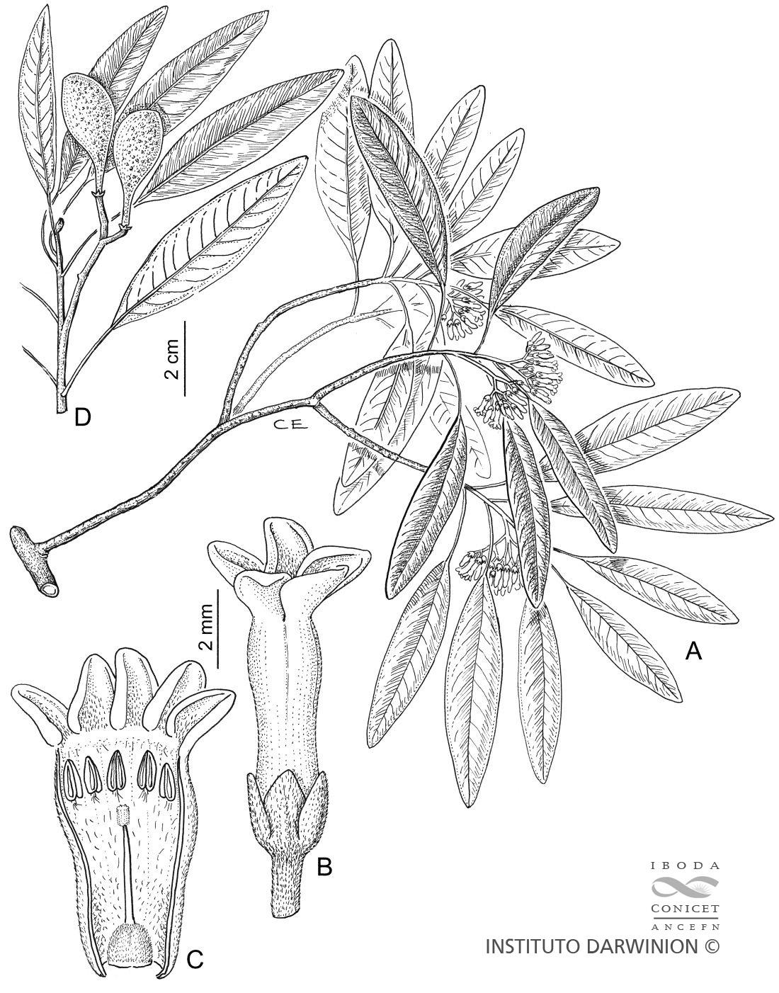 A. Rama florífera. B. Flor. C. Flor abierta para mostrar estambres, ovario, estilo y cabeza estilar. D. Rama con frutos.