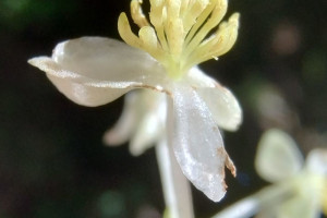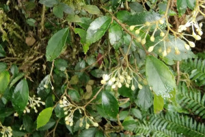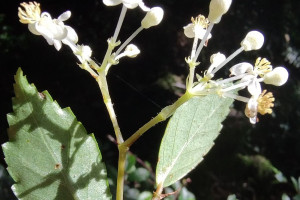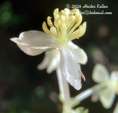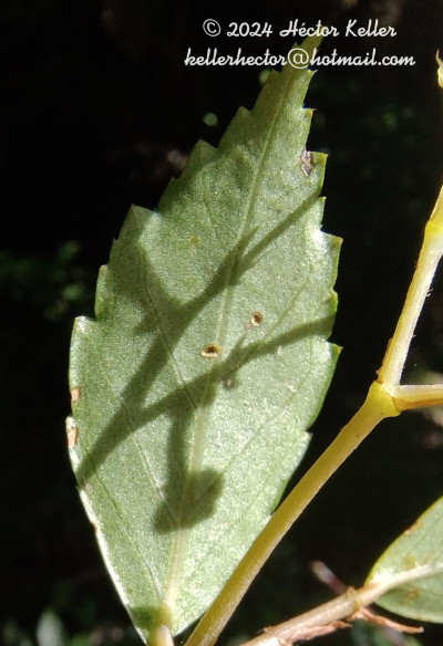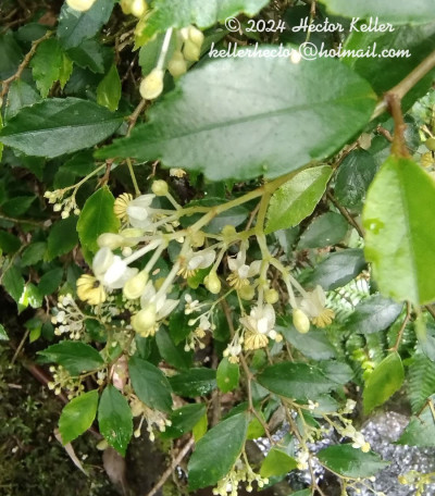 Subarbustos escandentes, creciendo sobre árboles o entre rocas y alcanzando hasta 2 m de alto, glabros. Tallos escandentes, subleñosos, estriados, muy ramificados, castaños, pubérulos cuando jóvenes, con tricomas simples, ferrugíneos. Estípulas triangulares o lanceoladas, de 0,4-1 × 0,1-0,3 cm, de base truncada, ápice mucronulado y margen entero, membranáceas, persistentes, erectas, glabrescentes. Pecíolos emergiendo a partir de los tallos, de 2-5,9 mm de largo, cilíndricos, glabros. Láminas enteras, basifijas, levemente asimétricas, elípticas o menos frecuentemente ovadas, de 4,5-8 × 1,5-2,5 cm, de base aguda o atenuada, ápice acuminado y margen aserrado y esparcidamente ciliado, papiráceas, cara adaxial verde, la abaxial verde o rojiza, penninervias. Cimas paucifloras a multifloras; pedúnculos de 0,5-2 cm de largo; brácteas 1 par, triangulares a lanceoladas, persistentes, de 3-8 × 1- 2 mm. Flores estaminadas con 4 tépalos blancos o verdosos, los externos ovados u obovados, de 3-5 × 2-3 mm, los internos elípticos u obovados, de 2-5 × 1-2 mm; bractéolas 1-3 pares, lanceoladas, de 2 × 1 mm, persistentes; estambres 10-20, ca. 3 mm de largo, filamentos libres, anteras elípticas u oblongas, ca. 1 mm de largo, introrsas. Flores pistiladas con 5 tépalos subiguales, imbricados, lanceolados, de 2-4 × 1 mm, blancos o verdosos; bractéolas 1-3 pares, lanceoladas, de 2-3 × 1 mm, persistentes; hipanto glabro; estilos de 4-5 mm de largo; ramas estigmáticas ca. 1 mm de largo. Cápsulas de 0,5-1 × 0,3-0,6 cm, placentas enteras; alas rudimentarias, semejantes entre sí. Semillas fusiformes.