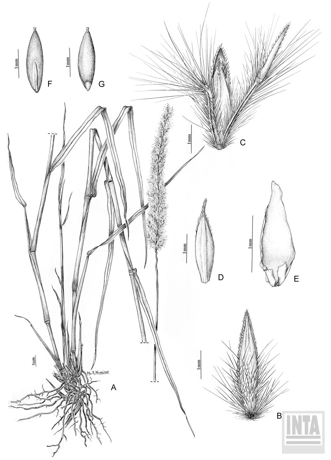 A. Planta. B. Espiguilla subsésil. C. Par de espiguillas y fragmento del raquis. D. Gluma superior vista dorsal. E. Pálea y lodículas. F. Cariopsis, vista escutelar. G. Cariopsis, vista hilar