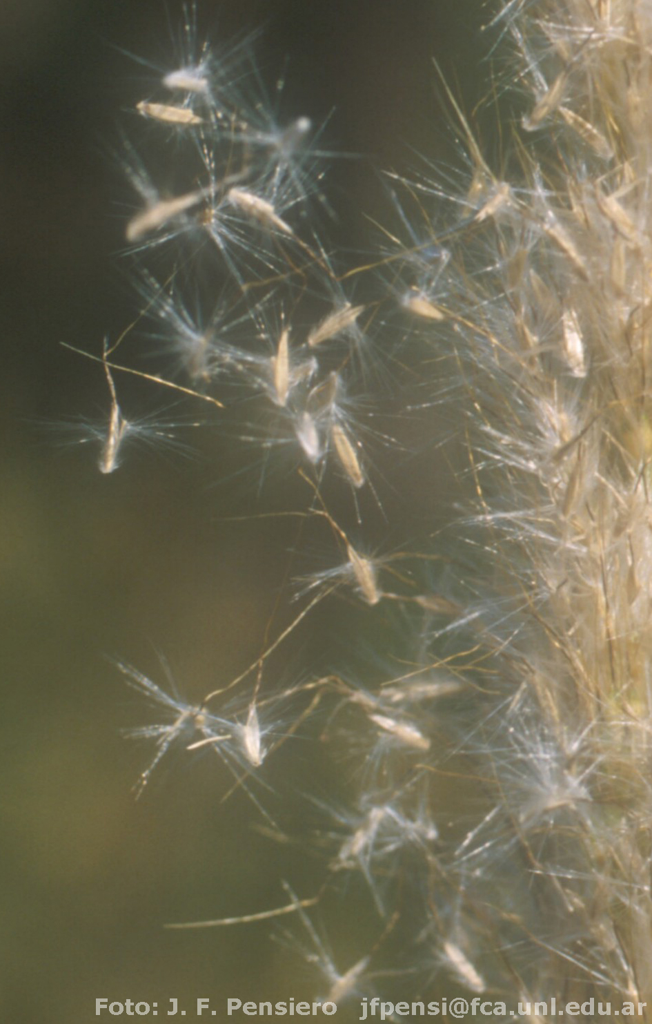 Plantas de 35-135 cm de alto, densamente macolladas en la base, follaje basilar o basilar y caulinar; cañas 5-6-nodes, de igual coloración o purpúreas en la proximidad de los nudos; nudos pilosos; vainas hirsutas, glabras o laxamente pubescentes; lígulas 0,8-1,2 mm de largo; láminas de 8,5-30 cm x 1,5-6 mm, planas, hirsutas o glabras; zona ligular hirsuta. Inflorescencia una panícula oblonga de 6-10,5 x 1,5-4 cm, con ramificaciones de 2,5-6 cm de largo, con abundante pilosidad blanco-sedosa o con tintes purpúreos. Espiguilla pedicelada de 2,5-3,5 x 0,2-0,3 mm, glabra, reducida, neutras. Espiguilla sésil de 3,5-5 x 0,7-1 mm, elipsoide, casmógama, no foveolada, o con fovéola ocasionalmente presente; gluma inferior escabrosa hacia el ápice, 7-9-nervia; gluma superior de 3,3-4,2 mm de largo, nervio medio escabroso hacia el ápice; lemma inferior de 2,8-3 mm de largo; arista 15-22 mm de largo.