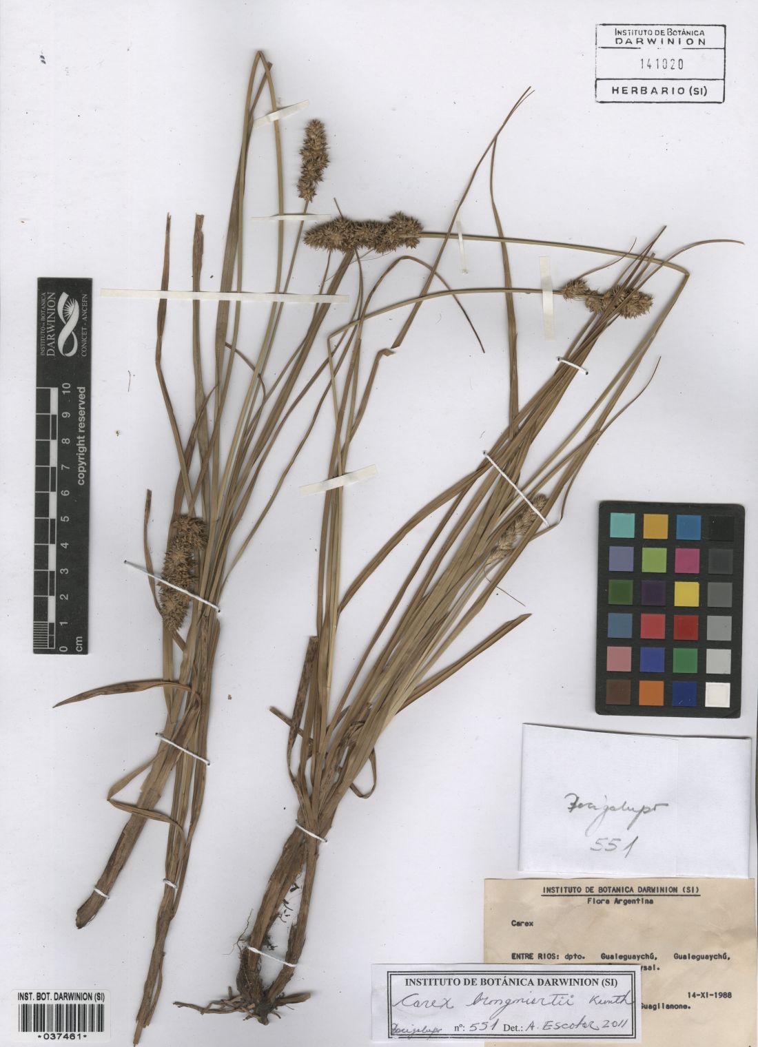 Observaciones: Iconography: Figures 1I, 2U, 3U. See additional figures in Gay (1854: tab. 73, fig. 10), Barros (1935: 198; 1947: tab. 177), and Silveira & Longhi-Wagner (2010; 2012: 383). Etymology: Commemorating Adolphe T. Brongniart, 1801–1876, a leading French plant taxonomist of the 19th century. Notes: Originally cited by Brongniart (1833) as Carex muhlenbergii Willd. The taxon was soon recognized as an independent species. Selected additional references: Pedersen [(1968) description], Silveira & Longhi-Wagner [(2010) ecology, (2012) description].