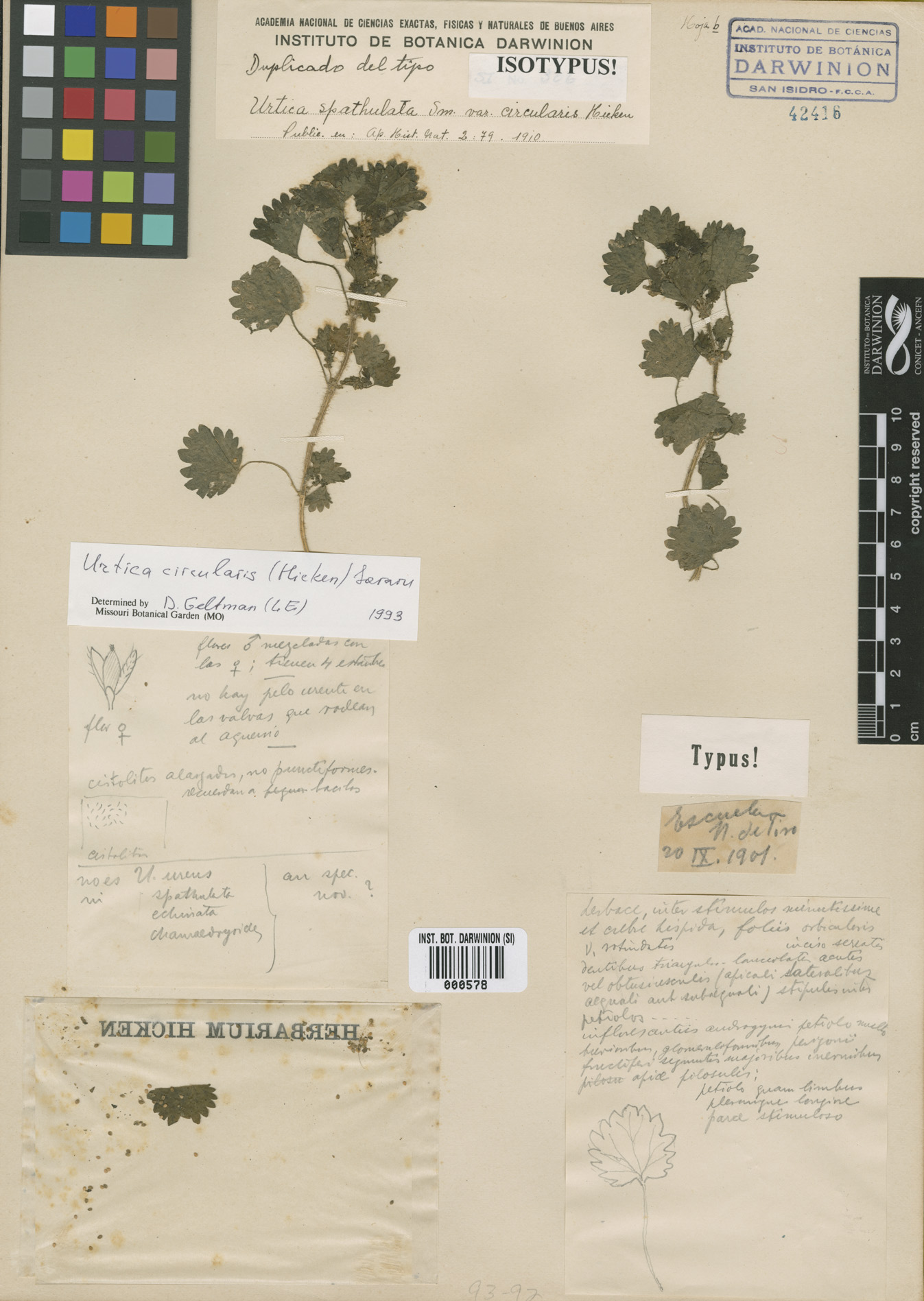 Tipo de Urtica spatulata Sm. var. circularis Hicken