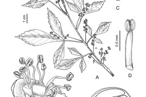 Árboles hasta de 15 m de alto o arbustos, semideciduos; tronco hasta de 10 cm de diámetro; ramas floríferas ca. 2 mm de diámetro, castaño-grisáceas, corteza irregularmente estriada y con lenticelas lineares breves, cuando jóvenes con costillas o estriados, glabras a excepción de tricomas glandulares o pilosas. Hojas con pecíolo de 2,9-3,5 cm de largo, semiterete o complanado, canaliculado, glabro a pubescente; lámina con 3 folíolos, sésiles o subsésiles, el terminal ovado- u obovadoromboidal, los laterales asimétricos, elípticos, elíptico-angostos u ovado-angostos, de 18-85 × 10-30 mm, relación largo folíolo terminal/largo folíolo lateral = 1,6:1, cartáceos; base del folíolo terminal largamente cuneada, asimétrica en los restantes, ápice en acumen obtuso mucronulado, margen con 4-19 dientes agudos u obtusos en 1/2 distal; cara adaxial verde-oscura y cara abaxial verde-clara, glabros a excepción de la vena media a veces pilosa, axilas barbadas. Inflorescencias en tirsos con ejes pubérulos, breves, ejes con tricomas simples breves y glandulares; pedúnculo de 1,2-2,2 cm de largo; raquis de 0,8-1,5 cm de largo, complanado; cincinos 1-4 floros, sésiles o subsésiles; pedicelo floral de 1-1,2 mm de largo, articulado poco por encima de la base; brácteas subuladas, ciliadas. Flores de 1,8-3,5 mm de largo; sépalos externos ovado-oblongos, de 0,75- 1,5 mm de largo, glabros, ciliados, los internos suborbiculares, de 1-1,5 mm de largo, con tricomas glandulares en el margen; pétalos con uña notable, espatulados, de 1-1,8 mm de largo, erosos, escama con el ápice escotado con 2 lengüetas inflexas y vellosas, poco más corta que el pétalo; lobos nectaríferos 4 (2 posteriores subcuadrangulares y 2 anteriores de contorno cuadrangular o triangular, poco menores), glabros o pubérulos; androginóforo pubérulo, desarrollado en la parte posterior; estambres de la flor estaminada de 2-2,5 mm de largo, filamentos glabros o pubérulos en la base, anteras glabras, en la flor pistilada ca. 0,5 mm de largo, glabros; pistilodio obcordado, brevísimo, glabro; gineceo ca. 1,5 mm de largo, ovario 2-carpelar con pubescencia blanquecina, tricomas simples y glandulares breves, estilo ca. 1 mm, menor que ramas del estigma 2-fido, glabro. Frutos cocos, de 4,8-7 × 4,2- 5,5 mm; epicarpo glabro, por lo común se desarrolla sólo un coco. Semillas de 4,8 × 4,2 mm; embrión con ambos cotiledones 2-plicados.