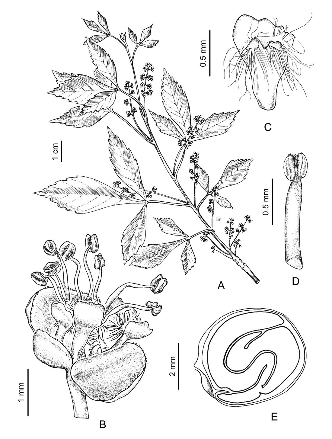 Árboles hasta de 15 m de alto o arbustos, semideciduos; tronco hasta de 10 cm de diámetro; ramas floríferas ca. 2 mm de diámetro, castaño-grisáceas, corteza irregularmente estriada y con lenticelas lineares breves, cuando jóvenes con costillas o estriados, glabras a excepción de tricomas glandulares o pilosas. Hojas con pecíolo de 2,9-3,5 cm de largo, semiterete o complanado, canaliculado, glabro a pubescente; lámina con 3 folíolos, sésiles o subsésiles, el terminal ovado- u obovadoromboidal, los laterales asimétricos, elípticos, elíptico-angostos u ovado-angostos, de 18-85 × 10-30 mm, relación largo folíolo terminal/largo folíolo lateral = 1,6:1, cartáceos; base del folíolo terminal largamente cuneada, asimétrica en los restantes, ápice en acumen obtuso mucronulado, margen con 4-19 dientes agudos u obtusos en 1/2 distal; cara adaxial verde-oscura y cara abaxial verde-clara, glabros a excepción de la vena media a veces pilosa, axilas barbadas. Inflorescencias en tirsos con ejes pubérulos, breves, ejes con tricomas simples breves y glandulares; pedúnculo de 1,2-2,2 cm de largo; raquis de 0,8-1,5 cm de largo, complanado; cincinos 1-4 floros, sésiles o subsésiles; pedicelo floral de 1-1,2 mm de largo, articulado poco por encima de la base; brácteas subuladas, ciliadas. Flores de 1,8-3,5 mm de largo; sépalos externos ovado-oblongos, de 0,75- 1,5 mm de largo, glabros, ciliados, los internos suborbiculares, de 1-1,5 mm de largo, con tricomas glandulares en el margen; pétalos con uña notable, espatulados, de 1-1,8 mm de largo, erosos, escama con el ápice escotado con 2 lengüetas inflexas y vellosas, poco más corta que el pétalo; lobos nectaríferos 4 (2 posteriores subcuadrangulares y 2 anteriores de contorno cuadrangular o triangular, poco menores), glabros o pubérulos; androginóforo pubérulo, desarrollado en la parte posterior; estambres de la flor estaminada de 2-2,5 mm de largo, filamentos glabros o pubérulos en la base, anteras glabras, en la flor pistilada ca. 0,5 mm de largo, glabros; pistilodio obcordado, brevísimo, glabro; gineceo ca. 1,5 mm de largo, ovario 2-carpelar con pubescencia blanquecina, tricomas simples y glandulares breves, estilo ca. 1 mm, menor que ramas del estigma 2-fido, glabro. Frutos cocos, de 4,8-7 × 4,2- 5,5 mm; epicarpo glabro, por lo común se desarrolla sólo un coco. Semillas de 4,8 × 4,2 mm; embrión con ambos cotiledones 2-plicados.