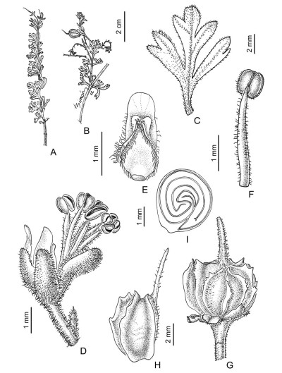 Arbustos apoyantes, ramosos, perennifolios, de 0,80-1,50 m de alto; indumento de tricomas simples breves y tricomas glandulares en tallos jóvenes, pecíolo y ejes de la inflorescencia; ramas de 1,5-1,8 mm de diámetro, castaño-claras, las jóvenes subteretes, las adultas castaño-rojizas con la epidermis que se desprende en tiras, glabras. Hojas con pecíolo de (1-)3-3,5 mm de largo; lámina ovado-pinnatisecta, raro cuneada, de 10-20 × 5-15 mm, 3-nervada, cartácea, concolora, rugosa en material desecado; vena media impresa en la cara adaxial, sobresaliente en la cara abaxial, las laterales inconspicuas; base decurrente, ápice 3-fido, obtuso; caras adaxial y abaxial pubérulas, tricomas simples y glandulares. Inflorescencias en cincinos 4-9-floros, escasos o varios en el ápice de las ramas, pedúnculo de 3-13 mm de largo; pedicelo floral de 2-5 mm de largo, en el fruto ca. 3,5 mm de largo; brácteas ovadas ca. 4,2 mm de largo, ápice redondeado, pubérulas; bractéolas pubescentes. Flores de 4,3-5,5 mm de largo; sépalos con lóbulos ovado-oblongos, de 2,5-3,5 mm de largo, ápice redondeado, pubérulos o pubescentes, ciliados; pétalos oblongo-angostos, de 2-3,5 mm de largo, ápice redondeado, densamente glandulosos en la cara interna, ciliados; escama en capuchón 2-crestado, velloso; hemidisco nectarífero 3-dentado, pubescente; estambres de la flor estaminada de 3,5-6 mm de largo, en la flor pistilada ca. 2,5 mm de largo, filamentos pubérulos, anteras azuladas, pubérulas; pistilodio piloso; gineceo con ovario piloso y estilo de 4-5 mm de largo, pubérulo. Frutos mericarpos crustáceos, castaño-claros, 3-gono-obovoides, de 10-12 × 4-5 mm, incluida la porción estilar de 5,5-6 mm de largo; alas dorsales ca. 1 mm de ancho, irregularmente dentadas y 2 crestas laterales menores, más angostas, unidas a la dorsal por varios nervios anastomosantes; epicarpo pubérulo o pubescente y endocarpo glabro. Semillas 3-gono-subesféricas, ca. 3,5 × 3 mm de diámetro; embrión con los cotiledones 2-plicados.
