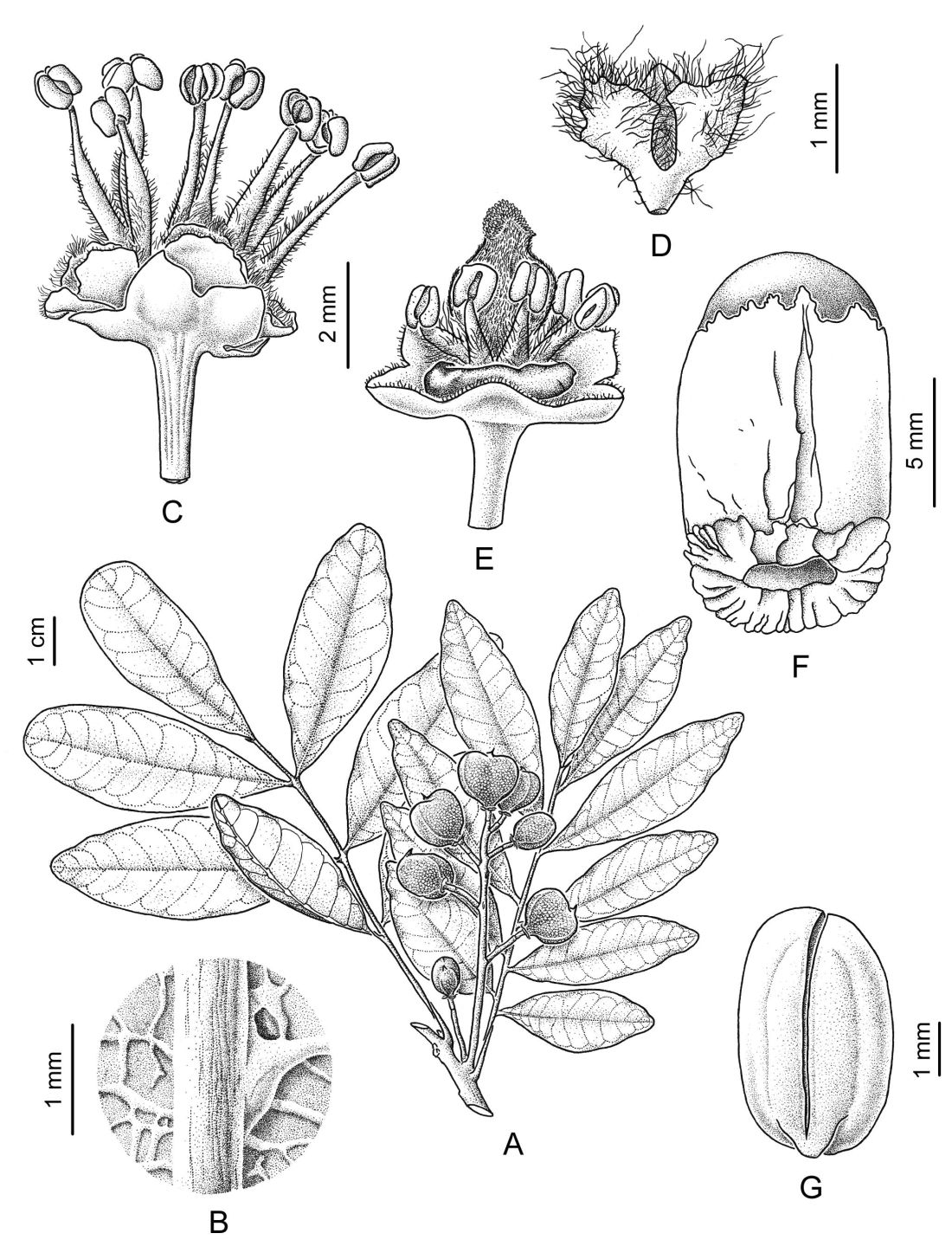 A. Rama con frutos casi maduros. B. Detalle del hipofilo mostrando un domacio urceolado. C. Flor estaminada. D. Pétalo, cara interna. E. Flor pistilada sin la corola. F. Semilla, vista ventral. G. Embrión.
