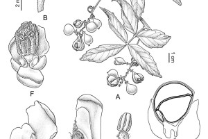 Trepadoras de 5-8 m de alto, glabriúsculas; indumento de tricomas blanquecinos breves, erectos o curvos, en tallos, ejes de la hoja e inflorescencia, densidad variable; tallos 5-6-costados, costillas redondeadas que generalmente alternan con otras prominentes, de sección subtriangular, cuando jóvenes pubescentes luego glabros; cámbiumes supernumerarios 3(-4-5). Hojas con estípulas subuladas, de 3-7 mm de largo, reflexas, escariosas, pubérulas; pecíolo de 1,4-6 cm de largo, 2-canaliculado, glabriúsculo o pubérulo; lámina 2-yugada, (3-)5-foliolada; raquis de 1-2,5 cm de largo, de menor longitud que el pecíolo, 2-canaliculado, pubérulo; peciólulo de 1-5 mm de largo, siempre más largo en el par de folíolos basales; folíolos oblongos, ovados o elípticos, de 3,5-12,5 × 1-5 cm, cartáceos, concoloros; base cuneada en folíolo terminal, redondeada u obtusa en los restantes, ápice obtuso o agudo, glandular, margen dentado-serrado, 3-14 dientes obtusos con glándula apical; cara adaxial glabra a excepción de la vena media pubérula, cara abaxial con escasos tricomas glandulares, axilas barbadas. Inflorescencias en tirsos con pedúnculo glabro o pubérulo; raquis estriado anguloso, pubescente; cincinos plurifloros, brevemente pedunculados o sésiles; pedicelo floral ca. 2,5 mm de largo, en el fruto de 2,5-3,5 mm de largo, articulado algo por encima de la base; brácteas triangulares, glabriúsculas o pubescentes. Flores de 4,5-6 mm de largo; sépalos externos suborbiculares, de 1,7-2,5 mm de largo, sépalos internos ovados, de 3-4 mm de largo; tricomas breves subadpresos en la cara externa, ciliados; pétalos oblongos, de 3-4,5 mm de largo, ápice redondeado, escama de los pétalos posteriores con cresta emarginada; lobos nectaríferos posteriores ovoide-obtusos, pubérulos, los anteriores muy reducidos; androginóforo pubérulo; estambres de la flor estaminada de 3,4-4 mm de largo, filamentos aplanados, pubescentes, a veces conniventes en la base, en la flor pistilada ca. 2,25 mm de largo; pistilodio con tricomas glandulares; gineceo ca. 3,5 mm de largo, ovario ovoide con tricomas glandulares muy breves, estilo igual, más largo o más corto que ramas del estigma. Frutos cápsulas turbinadas, de 1,3-2 × 1-1,5 cm, incluido el estípite de 2-8 mm de largo, apiculadas, superficie con estrías oblicuas, epicarpo y endocarpo glabros. Semillas 3-gono-elipsoides, de 6-9,5 × 6-7 mm de largo; arilo de 1/2-2/3 del largo de la semilla, hendido en 2 lóbulos; embrión subesférico, de 4-6,5 mm de diámetro.
