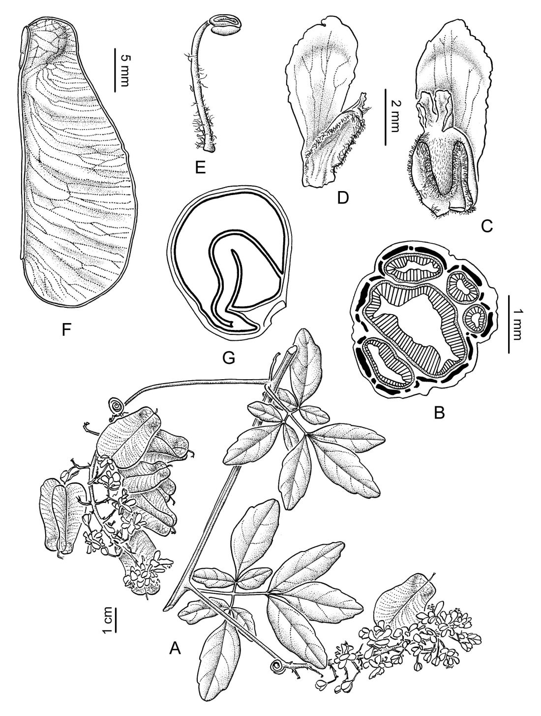 Trepadoras glabriúsculas o pubescentes; tallos con costillas poco marcadas o subteretes, cuando jóvenes con tricomas glandulares diminutos, luego glabros; cámbiumes supernumerarios 3-8. Hojas con estípulas triangulares, de 1-2 mm de largo, persistentes, glabras o pubescentes; pecíolo canaliculado o submarginado, de 1,5-5,5 cm de largo, glabro; lámina 2-yugada, par basal con 3 foliólulos, o bien (3-)5-foliolada; raquis primario y ráquises secundarios 2-canaliculados o submarginados, glabros o pubérulos; folíolo terminal generalmente con peciólulo notable, a veces sésil, los restantes sésiles o con peciólulo; folíolos oblongos, oblongo-anchos, ovados u ovado-angostos, de 1,5-11 × 0,7- 5,5 cm, folíolos cartáceos, discoloros; base decurrente, a veces redondeada en los folíolos laterales, ápice obtuso, retuso o con poca frecuencia agudo, margen dentado-serrado, por lo común un número reducido de dientes obtusos (1-14), raro subentero, en láminas 5- o 3-folioladas el margen a veces lobadodentado, con 2 lóbulos; cara adaxial glabra o pubérula, cara abaxial glabra a excepción de axilas barbadas o pubescente. Inflorescencias en tirsos con tricomas glandulares diminutos en los ejes, a veces además algunos tricomas simples o bien completamente glabros; cincinos con pedúnculo de 2,5-6 mm de largo; pedicelo floral de 4,5-5,5 mm de largo, en el fruto hasta de 11 mm de largo, articulado poco por encima de la base o en 1/3 basal; brácteas de 1,5 mm de largo, glabras, con tricomas glandulares en el margen. Flores de 5-8,5 mm de largo, fragantes; sépalos externos de 3-5 mm de largo, glabros en la cara externa, los internos de 4-8 mm de largo, con pubescencia densa en la cara externa, en todos el margen ciliado; pétalos de 4-8 mm de largo, glandulosos en la cara interna, escama con cresta dividida hasta la base en los pétalos posteriores; lobos nectaríferos poco notables, los posteriores ovoides, los anteriores de contorno subelíptico o anular, a veces pubérulos; androginóforo glabro; estambres de la flor estaminada de 4-6 mm de largo, filamentos glabros, pubérulos o pubescentes, en la flor pistilada ca. 3 mm de largo; pistilodio con tricomas glandulares diminutos; gineceo de 5-8 mm de largo, ovario con tricomas glandulares, estilo 3-5 veces más largo que las ramas del estigma. Frutos esquizocarpos ovado-cordados, de 1,9-3,3 × 1,8-2,7 cm, a nivel de los lóculos de 1-1,2 cm de ancho, cartáceos, porción seminífera del mericarpo inflada, a veces con cresta dorsal angosta, constricción notable debajo de la misma o nula; epicarpo glabro, a excepción de escasos tricomas glandulares próximos al eje, endocarpo glabro. Semillas subesféricas, de 4,5-5,5 mm de diámetro, insertas en la base de los lóculos; embrión con el cotiledón externo curvo y el interno 2-plicado.
