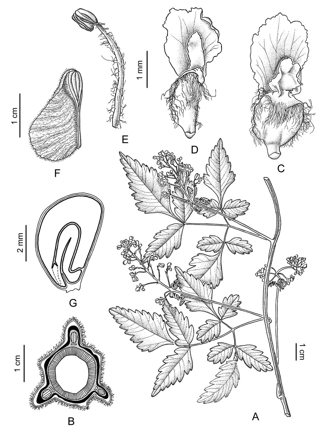 Trepadoras pubescentes, con indumento de tricomas blanquecinos, breves y crespos en el tallo, estípulas, pecíolo, raquis y ejes de la inflorescencia; tallos con 6 costillas; 3(-4) cámbiumes supernumerarios equidistantes determinan costillas muy prominentes. Hojas con estípulas triangulares, de 0,5- 1 mm de largo, persistentes; pecíolo de 1,2-3,7 cm de largo, canaliculado; lámina 2-yugada, par basal con 3 foliólulos; raquis primario y ráquises secundarios 2-canaliculados; peciólulo marginado, de 0,7-1,5 cm de largo en folíolo y foliólulos terminales, de 1-3 mm de largo en los demás; folíolos ovados u ovado-angostos, de 1,8-6,5 × 1-3 cm, cartáceos, discoloros, ciliados; foliólulos laterales internos notablemente menores; base decurrente en folíolo y foliólulos terminales, obtusa o aguda en los demás, ápice obtuso o agudo, mucronado, margen inciso-dentado, con 1 par de incisiones basales y 16-24 dientes agudos u obtusos; cara adaxial pubérula, cara abaxial pubescente. Inflorescencias en tirsos con cincinos subverticilados; pedúnculo del cincino de (4-)6,5-18 mm de largo; pedicelo floral ca. 2,5 mm de largo, pedicelo del fruto de 2,5-5(-9) mm de largo, articulado ca. de la mitad; brácteas de 1,5 mm de largo, pubescentes o pubérulas. Flores de 3,75- 5 mm de largo; sépalos externos, de 2,75-3,75 mm de largo, pubescentes en la cara externa, con tricomas brevísimos y crespos en la cara interna, los internos de 4-4,5 mm de largo, tricomas brevísimos y crespos en la cara externa; pétalos de 3,5-5,25 mm de largo, glandulosos en ambas caras, escama con cresta erosa o emarginada en los pétalos posteriores; lobos nectaríferos ovoides, los posteriores obtusos, los anteriores agudos, reflexos; glabros o pubérulos; androginóforo glabro o pubescente; estambres de la flor estaminada de 3-4 mm de largo, filamentos pubescentes, en la flor pistilada ca. 2 mm de largo; pistilodio velloso; gineceo con el ovario velloso, estilo más largo que las ramas del estigma. Frutos esquizocarpos, ovado-cordados, de 1,7-2 × 2,2 cm, a nivel de los lóculos de 0,9-1 cm de ancho, cartáceos, porción seminífera del mericarpo complanada con cresta dorsal revoluta, sin constricción debajo de la misma; epicarpo pubérulo o pubescente, velloso sobre los lóculos, endocarpo lanoso. Semillas 3-gono-obovoides, de 5,5 × 2,75-3,5 mm, insertas en la base de los lóculos; embrión con el cotiledón externo curvo y el interno 2-plicado.