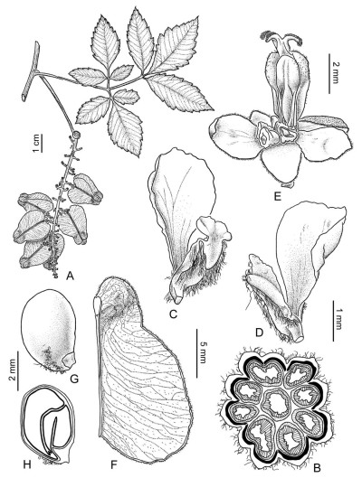 Trepadoras pubescentes, hasta de 15 m de alto; indumento denso de tricomas breves, crespos, blanquecinos a ferrugíneos, en tallos, pecíolos, ráquises y ejes de la inflorescencia; tallos con 8-10 costillas notables; cámbiumes supernumerarios 8-10 de aproximadamente igual tamaño que el cámbium central. Hojas con estípulas triangulares, de 0,75-2,25 mm de largo, pubescentes, persistentes; pecíolo de 3-6 cm de largo, canaliculado; lámina 2-yugada, par basal con 3 foliólulos; raquis primario y ráquises secundarios 2-canaliculados; peciólulo de 0,2-1,5 cm de largo en el folíolo terminal, en los demás de 0,1-0,2 cm de largo; folíolo terminal ovado u ovadoangosto, los laterales elípticos u ovado-angostos, de 1,5-10 × 0,7-4,5 cm, ciliados, cartáceos y discoloros; base cuneada, ápice agudo u obtuso mucronado, margen dentado-serrado; cara adaxial pubérula o pubescente, cara abaxial pubescente, axilas barbadas. Inflorescencias en tirsos con pedúnculo del cincino de 1,25-3 mm de largo; pedicelo del fruto 1,5-3,5 mm de largo, articulado ca. de la base; brácteas ca. 2 mm de largo, pubescentes. Flores de 3-6,5 mm de largo; sépalos externos de 2-2,5 mm de largo, los internos de 2,6-3 mm de largo, todos velutinos en ambas caras; pétalos de 2,5-3,5 mm de largo, glandulosos en la cara interna, escama con cresta entera, emarginada o 2-auriculiforme en los pétalos posteriores; lobos nectaríferos posteriores ovoide-obtusos, los anteriores ovoide-agudos, pubérulos; androginóforo glabro; estambres en flor estaminada de 3-4,5 mm de largo, filamentos pubérulos o pubescentes, en la flor pistilada ca. 2 mm de largo; pistilodio glabro o pubescente; gineceo de 4,5 mm de largo, con ovario pubescente, estilo pubérulo más corto, igual o más largo que las ramas del estigma. Frutos esquizocarpos ovado-cordados, de 1,8-2 × 1,8-2 cm, a nivel de los lóculos de 6-8 mm de ancho, cartáceos, porción seminífera del mericarpo inflada, con constricción debajo de la misma; epicarpo con la porción seminífera pubérula o pubescente, el resto glabro o glabriúsculo, endocarpo con algunos tricomas breves. Semillas 3-gono-elipsoides, de 4-4,5 × 2,5 mm, tegumento pubérulo a la altura de la radícula; embrión con ambos cotiledones rectos, menos frecuente el cotiledón externo curvo y el interno con un pliegue.