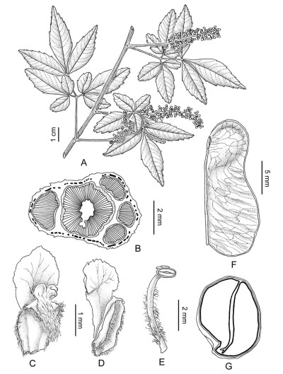 Trepadoras glabras, hasta de 15 m de alto; tallos jóvenes y ejes de inflorescencia pubescentes; tallos con costillas cuando jóvenes con indumento denso de tricomas breves y curvos; cámbiumes supernumerarios 4-7. Hojas con estípulas oblongas, ca. 3 mm de largo, glabras, caducas, cicatriz semilunada; pecíolo de 2,4-8 cm de largo, canaliculado, glabro; lámina 2-yugada, par basal con 3 foliólulos, raquis primario 2-canaliculado, ráquises secundarios marginados, ambos glabriúsculos; peciólulo de 0,6-1,3 cm de largo en el folíolo terminal, breve en los demás; folíolos ovado-lanceolados, de 1,2-10 × 0,6-4 cm, cartáceos; base decurrente en el folíolo y foliólulos terminales, cuneada u obtusa en los demás, ápice agudo u obtuso, mucronado, margen dentado-serrado con 10-16 dientes generalmente agudos; cara adaxial y abaxial glabras, axilas barbadas. Inflorescencias en tirsos; pedúnculo del cincino de 1-2 mm de largo; pedicelo de 3,5-5 mm de largo, articulado en 1/3 basal o por encima de la base; brácteas ca. 1 mm de largo, ciliadas. Flores de 3,5-5,5 mm de largo; sépalos externos de 2,5-3 mm de largo, glabros o glabriúsculos en la cara externa, los internos de 3-4 mm de largo, velutinos en cara externa; pétalos de 3,5-5,5 mm de largo, glandulosos en la cara interna escama con cresta 2-auriculiforme en los pétalos posteriores; lobos nectaríferos posteriores ovoide-obtusos, los anteriores de contorno elíptico; androginóforo glabro; estambres en la flor estaminada de 3-4 mm de largo, filamentos pubescentes, en la flor pistilada ca. 2,5 mm de largo; pistilodio glabro; gineceo con tricomas glandulares breves sobre el ovario, estilo más largo que ramas del estigma. Frutos esquizocarpos ovoideo-cordados, de 2-2,2 × 1,4-2 cm, a nivel de los lóculos de 1-1,2 cm de ancho, cartáceos, porción seminífera del mericarpo complanada, constricción leve debajo de la misma, base de los lóculos notablemente cuneada; epicarpo glabro, endocarpo glabro o con tricomas algo crespos, funículo pubescente. Semillas elipsoides, complanadas, ca. 5 × 4 mm, insertas ca. en la mitad de los lóculos; embrión con el cotiledón externo curvo y el interno biplicado o bien ambos cotiledones rectos.