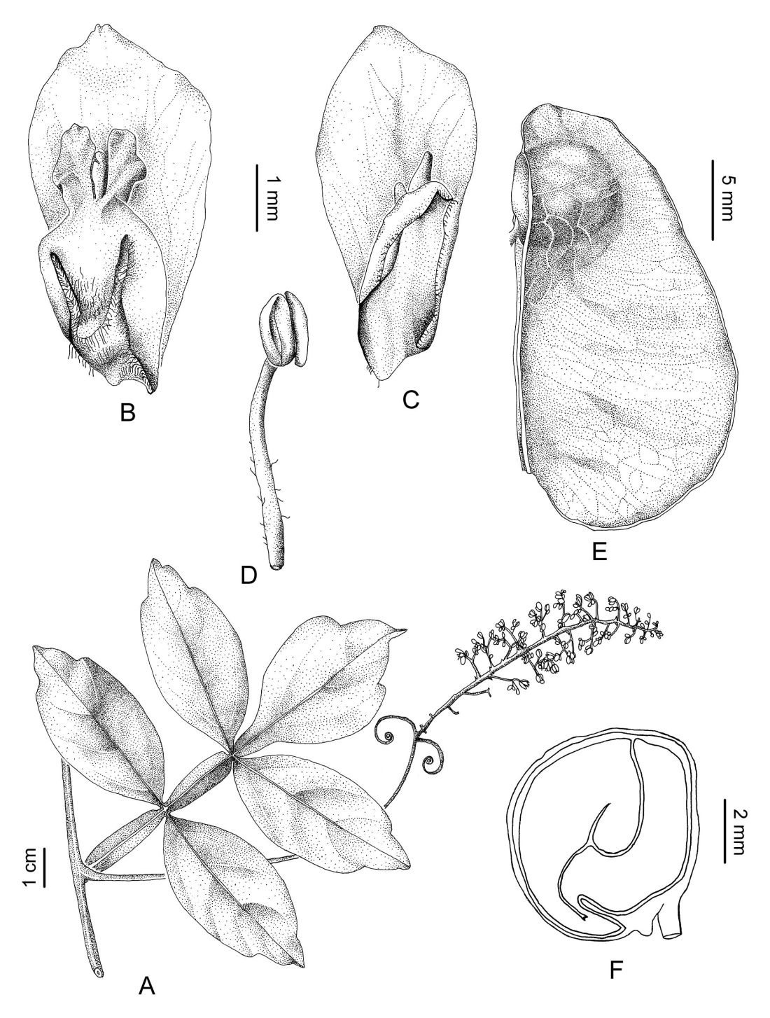 Trepadoras, generalmente glabras, a veces pubescentes; tallos subteretes, glabros o con tricomas breves y curvos, epidermis caediza; cámbiumes supernumerarios 1-3, raro cámbium único en ramas jóvenes. Hojas con estípulas triangulares, de 1-1,5 mm de largo, glabras o pubescentes, con tricomas glandulares en el margen, persistentes; pecíolo de 1,2-7,5 cm de largo, alas de 1,5-3(-6) mm de ancho, de mayor longitud que el raquis, glabro o pubescente; lámina 2-yugada, a veces el par basal con 3 foliólulos; raquis primario de 1-4,7 cm de largo, alas de 1,6-3(-6) mm de ancho, glabro o pubescente, ráquises secundarios también alados; peciólulo alado; folíolos a veces sésiles, el terminal obovado, elíptico u ovado, los laterales oblongos, ovado- u obovado-anchos, oblongo-angostos o elípticos, de 3,8-8,3 × 2-5,2 cm, cartáceos, discoloros; base decurrente en el folíolo terminal, cuneada en los laterales, ápice agudo u obtuso, margen subentero o con 3-4(-6) dientes, agudos u obtusos, generalmente próximos al ápice; cara adaxial glabra o pubérula, cara abaxial glabra o pubescente, a veces axilas barbadas. Inflorescencias en tirsos con ejes pubérulos o pubescentes; pedúnculo del cincino de 3-5 mm de largo; pedicelo de 2,5-3,2 mm de largo, articulado en la base; brácteas de 1,25-2,25 mm de largo, con tricomas glandulares en el margen. Flores de 3,5-8,5 mm de largo; sépalos externos de 3-4,75 mm de largo, glabros o con ambas caras velutinas; internos subiguales, velutinos en la cara externa; pétalos de 4,5-7 mm de largo, glandulosos en la cara interna; escama con cresta 2-partida en los pétalos posteriores; lobos nectaríferos posteriores agudos u obtusos, los anteriores de contorno elíptico, menores; androginóforo glabro o pubescente; estambres en la flor estaminada de 3,5-7,25 mm de largo, filamentos glabros o pubérulos, en flor pistilada de 3,5-4 mm de largo; pistilodio con tricomas glandulares; gineceo de 3-7,5 mm de largo, con tricomas glandulares y simples en el ovario, estilo de 3-4,5 mm de largo, ramas del estigma breves. Frutos esquizocarpos ovoideo-cordados, de 2,4-2,7 × 2,8-3,5 cm, a nivel de los lóculos de 1,7 cm de ancho, coriáceos, porción seminífera del mericarpo complanada, con cresta dorsal de 2-2,5 mm de ancho, sin constricción debajo de la misma; epicarpo pubérulo, endocarpo glabro. Semillas 3-gono-lenticulares, de 6-8 mm de diámetro, insertas en al base de los lóculos; embrión con el cotiledón externo curvo y el interno 2-plicado.