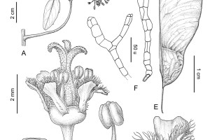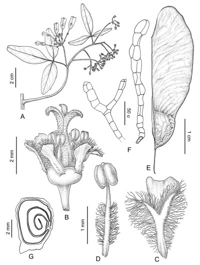 Trepadoras glabriúsculas, zarcillos 2-fidos en la axila de la hojas; indumento de tricomas simples y tricomas glandulares diminutos adpresos en tallos jóvenes, ejes de la hoja e inflorescencia; tallos jóvenes subteretes, estriados, los adultos con lenticelas puntiformes castaño-amarillentas, glabros; en un tallo ca. 9 mm de diámetro 5 cámbiumes supernumerarios. Hojas con estípulas de 0,3-0,5 mm de largo, glabras; pecíolo de 1,9-7,3 cm de largo, pubescente, tricomas brevísimos; peciólulo del folíolo terminal notable, de 5,5-14 cm de largo, en los folíolos laterales de 3-7,5 mm de largo, de mayor longitud en el folíolo terminal; folíolos generalmente ovado-angostos y con una banda castaño-verdosa a lo largo de vena principal y venas secundarias (en material herborizado), folíolos laterales ovados, con la semilámina externa más ancha que la interna, de 4-9 × 1,5-4 cm, cartáceos, opacos, concoloros; base aguda, obtusa o truncada, a veces decurrente en el folíolo terminal, ápice agudo u obtuso, mucronado, margen no revoluto, serrado-dentado con 4-6 dientes obtusos glandulares, o raro subentero en la misma rama; caras adaxial y abaxial glabras o glabriúsculas, axilas barbadas; 4-5 pares de venas secundarias. Inflorescencias en tirsos ecirrosos; pedúnculo de 1,9-3 cm de largo; cincinos plurifloros con pedúnculo de 1,5-6 mm de largo; pedicelo de 3,5-4 mm de largo, en el fruto 5-6 mm de largo, articulado en 1/3 basal o en la base, glabro; brácteas pilosas. Flores de 3,5- 4,35 mm de largo; sépalos ca.1 mm de largo, glabros, ciliados; pétalos espatulados, largamente unguiculados, de 1,5-2,2 mm de largo, con ápice reflexo, erosos, tricomas pluricelulares lineares dispersos en ambas caras, tricomas glandulares agrupados en parte media de la porción apical de la cara externa, escama vellosa poco más corta que el pétalo; disco nectarífero glabro; estambres de la flor estaminada de 2,5-3 mm de largo, filamentos con tricomas crespos en 1/2 basal o velloso en 2/3 proximales, anteras pubérulas, en flor pistilada ca. 2 mm de largo, filamentos vellosos; pistilodio piloso; gineceo de 3 mm de largo, ovario pubescente, tricomas adpresos en 1/2 distal, estilo casi ausente hasta tan largo como ramas del estigma, ambos con tricomas simples adpresos. Frutos esquizocarpos de 4-5 × 2,6-2,9 cm, incluido el estípite de 5-7 mm de largo; porción seminífera del mericarpo inflada, cuneado-truncada, de 1,15-1,3 × 0,6 cm, venación retinervada impresa, con constricción apenas marcada sobre el lóculo, cartáceos; epicarpo glabriúsculo a pubérulo, endocarpo con tricomas simples y pluricelulares ramificados, en parte 2-seriados. Semillas obovoides, de 5,5-7 × 4,6-6,5 mm; embrión con ambos cotiledones 2-plicados o el cotiledón externo curvo y el interno 2-plicado o circinado.