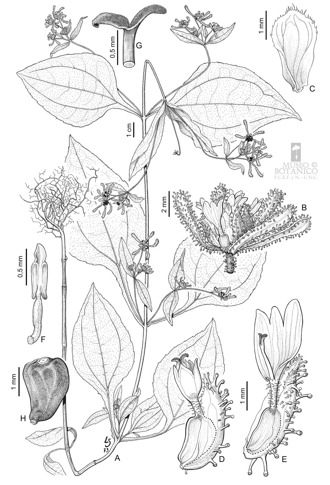 Hierbas anuales de 40-80 cm de alto, con tallos hirsutos, erectos. Hojas opuestas, anchamente ovadas, de 6-14 × 4-5,2 cm, enangostadas en un pecíolo alado, las inferiores auriculadas y connadas, las superiores sésiles y semiabrazadoras, margen uniformemente aserrado (dientes diminutos), laxamente pilosas, el envés con glándulas punctiformes amarillas. Capítulos sobre pedúnculos largos, delgados, glanduloso-pilosos, ordenados en cimas paucicéfalas en el extremo de ramitas axilares y terminales. Involucro acampanado; filarios 2-seriados, los externos abiertos, oblanceolados, de 10-14 mm de largo, con pelos glandulares capitados, los internos ca. 4 mm de largo, también glandulosos y casi abrazando a las flores del margen. Flores del margen pistiladas, con corola amarilla, lígula 3-dentada de 2-2,8 mm de largo y tubo de 1-1,4 mm de largo, piloso; las del centro perfectas, con corola tubulosa, de 2-2,4 mm de largo, con limbo acampanado, 5-dentado y tubo corto, piloso. Aquenios obovoides, ca. 2 mm de largo, gruesos, oscuros, tetrágonos, ligeramente comprimidos lateralmente.