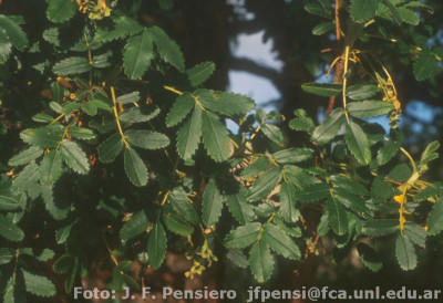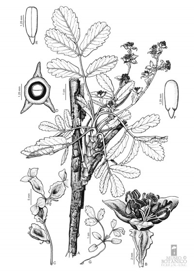 Árboles hasta de 8 m de alto. Folíolos 5-7, con lámina elíptica o ligeramente obovada, de 1,5-3,5 cm de largo, ápice emarginado, margen serrado, glabra en ambas caras; raquis híspido. Racimos paucifloros (4-10 flores), de 4-8 cm de largo. Flores de 6-10 mm de diámetro; bráctea de 2-4 mm de largo; receptáculo glabro; sépalos 3(-4), verdes, glabros o con algunos tricomas cerca del ápice en la cara externa; estambres 7-13, anteras con un mechón denso de tricomas blancos y rectos en la mitad superior; estigma pateliforme, de 2-4 mm de largo. Cupela obcónica, glabra, con 2-3 alas, el margen eroso o sinuoso. Observaciones. Bitter (1911), al describir Polylepis australis, se refirió a una colección hecha por Lorentz en Córdoba, así como a una ilustración de la cupela. Desafortunadamente, la colección estudiada por Bitter, presuntamente alojada en GOET, no pudo ser localizada [M. Appelhans y O. Khurelpurev (GOET), com. pers.]; sin embargo, el protólogo incluye una ilustración que constituye material original. De acuerdo a Simpson (1979: 58), “When Bitter described Polylepis australis, he neglected to cite any specimens that could be associated directly with the specific epithet”; consecuentemente, el autor designó como lectotipo del nombre un duplicado de la colección Fries 264 —proveniente de Jujuy, Argentina— alojado en S. Si bien el ejemplar escogido por Simpson concuerda con el uso actual de P. australis, la tipificación no es válida debido a que el material que fija la aplicación del nombre no es original.