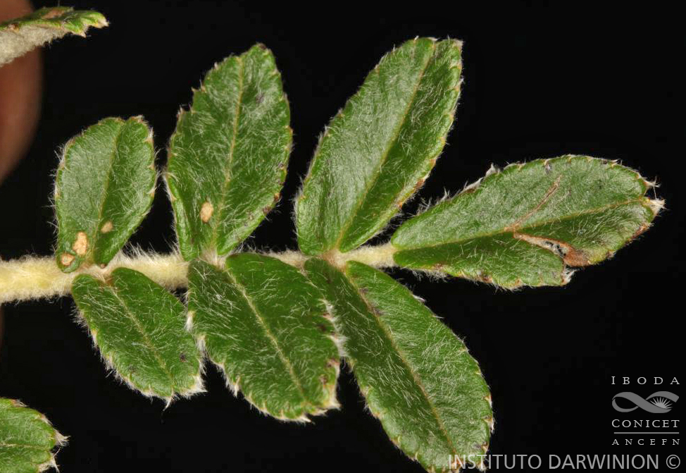 Árboles hasta de 8 m de alto. Folíolos 7-9 con lámina obovada, de 1,5-2,5 cm de largo, ápice emarginado, margen crenado, vilosa en la cara adaxial, serícea o vilosa en la cara abaxial con tricomas blanquecinos que cubren la venación; raquis tomentoso. Racimos multifloros (15-25 flores), de 8-15 cm de largo. Flores de 5-9 mm de diámetro; bráctea de 3-6 mm de largo; receptáculo tomentoso; sépalos 3-4, verdes, seríceos en la cara externa; estambres 9-15, anteras con un mechón denso de tricomas blancos y rectos en la mitad superior; estigma fimbriado, de 1-3 mm de largo. Cupela cilíndrica, serícea o vilosa, con 2-5 apéndices espiniformes.