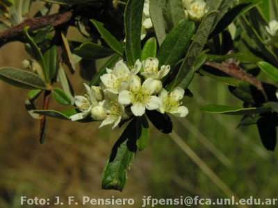 Arbustos hasta de 5 m de alto, espinescentes; tallos tomentosos cuando jóvenes, glabrescentes a la madurez. Hojas con pecíolos de 0,1-0,3 cm de largo, en ocasiones sésiles; lámina oblanceolada u oblonga, de 1-6 × 0,4-1 cm, ápice apiculado, mucronado u obtuso, base atenuada, margen entero, glabra o con tricomas ralos en la cara adaxial, tomentosa con tricomas blanquecinos en la cara abaxial. Inflorescencias con pedúnculos tomentosos. Flores ca. 2,5 mm de diámetro; pedicelos de 1-2 mm de largo; receptáculo tomentoso; sépalos de 0,8-1,1 mm de largo, tomentosos; pétalos orbiculares con ápice emarginado o redondeado, de 3,5-5 mm de largo. Nuculario globoso, de 5-6 mm de diámetro, rojo-anaranjado.