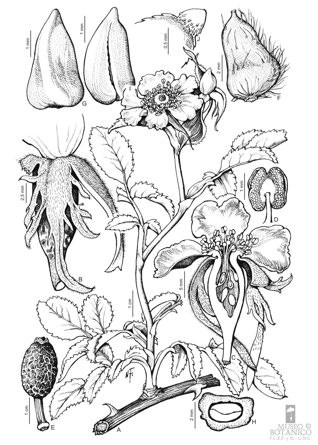A. Rama florífera. B. Sector de cáliz con pétalos dimorfos. C. Corte longitudinal por flor. D. Estambre. E. Cinorrodon. F. Aquenio. G. Semilla. H. Transcorte por semilla. I. Embrión. J. Radícula, hipocótilo papiloso, base del cotiledón con dientes (de A. T. Hunziker 24433, CORD).