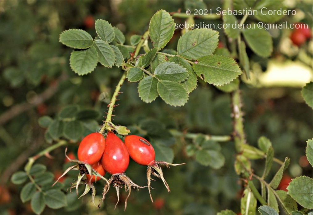 Observaciones: Nombre vernáculo y usos. “Rosa mosqueta”. Utilizada como ornamental y medicinal para afecciones diversas (Cantero et al., 2019; Diazgranados et al., 2020; más referencias disponibles en https://temperate.theferns.info/viewtropical.php?id=Rosa+rubiginosa). Los cinorrodones son útiles para la preparación de dulces e infusiones y los pétalos/brotes tiernos son comestibles (Kunkel, 1984; Facciola, 1990) Observación. La designación de lectotipo por parte de Turland (1996: 565) es superflua debido a que es posterior a la elección de Ghora & Panigrahi (1995) [discusión detallada dada por Reichert (en Gleditschia 24: 18-22. 1997)].