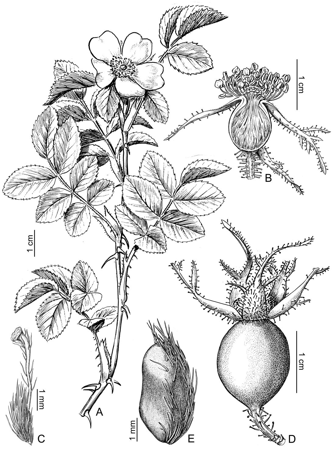 A. Planta. B. Flor, corte longitudinal. C. Pistilo. D. Cinorrodon. E. Aquenio.