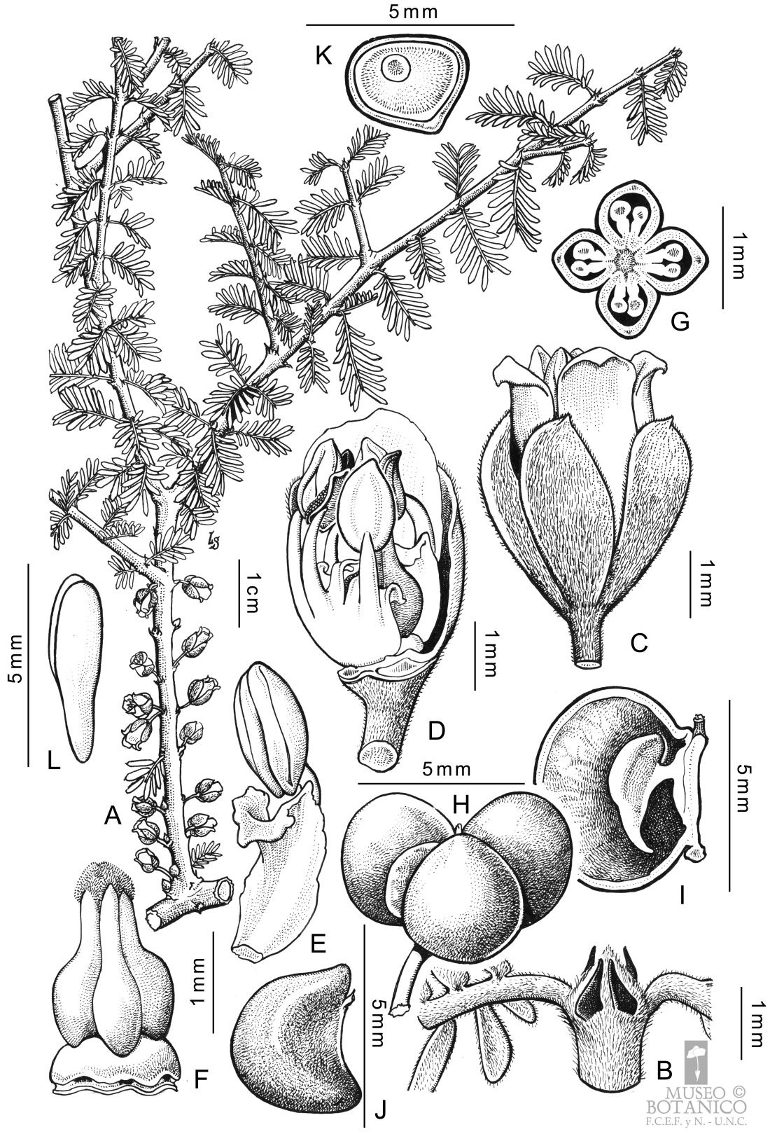 A. Rama florífera. B. 2 hojas opuestas estipuladas. C. Flor, vista lateral. D. Flor, estructura interna. E. Estambre oposipétalo mostrando la lámina apendicular del filamento. F. Gineceo. G. Transcorte por ovario. H. Fruto. I. Corte longitudinal de un carpelo de fruto muy inmaduro. J-K. Semilla, corte lateral y transversal respect. (materiales floríferos de Subils 768, CORD; materiales fructíferos de Kurtz 8708, CORD).
