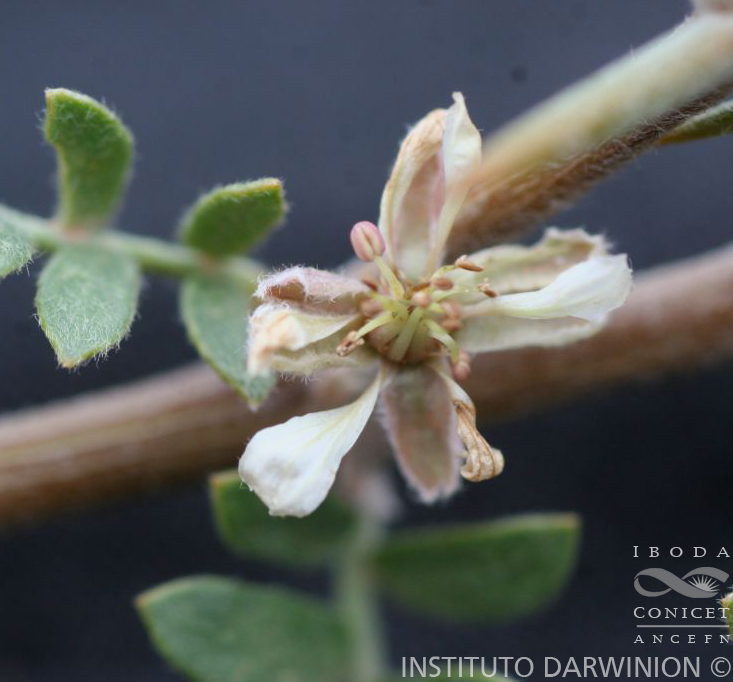 Subarbusto o arbusto; tallos con (4-)5 espinas rígidas de ca. 1 cm de largo, existiendo en el punto de inserción de ellas otra pequeña ca. 1 mm de largo; entrenudos de 1-2,8 cm de largo. Hojas 3-4 yugas, de 15-30 × 10-18 mm, fasciculadas; estípulas 2, linear-lanceoladas, de 3-5 mm de largo, apenas pubescentes, rojizas, caducas; folíolos oblongos, de 6-9 × 2-4 mm, asimétricos, generalmente alternos, mucronados, con dos nervaduras prominentes en ambas caras, pubescentes. Flores con pedúnculos de 1-2 mm de largo, pubescentes; sépalos obovados, de 3-5 × 2-3 mm, desiguales, imbricados, pubescentes; pétalos cóncavos, ca. 7 × 3 mm, amarillos; estambres 10, desiguales, rojizos, filamentos subulados de 5 mm de largo, gruesos, con una escama dentiforme de 4 mm de largo, gruesa, connada en casi toda su longitud, con una convexidad en la parte superior de su cara ventral y dos expansiones aliformes laterales; la cara dorsal en su parte superior, terminada en dos pares de lacinias, casi tan largas como el filamento; anteras ovoides, de 1 mm de largo, apenas sagitadas, mucronadas; ovario ovoide, de 3 mm de largo, 5-locular, 5-alado, con una espina en el dorso de cada carpelo. Fruto carcérulo, con 5 alas triangulares, de 10-15 × 15-20 mm, con una espina dirigida hacia abajo, pubescente. Semillas 5, aplanadas, de 6 × 2 mm.