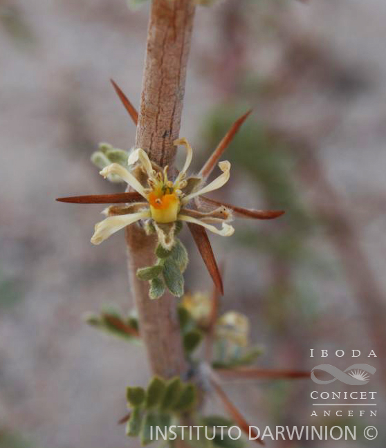 Subarbusto o arbusto; tallos con (4-)5 espinas rígidas de ca. 1 cm de largo, existiendo en el punto de inserción de ellas otra pequeña ca. 1 mm de largo; entrenudos de 1-2,8 cm de largo. Hojas 3-4 yugas, de 15-30 × 10-18 mm, fasciculadas; estípulas 2, linear-lanceoladas, de 3-5 mm de largo, apenas pubescentes, rojizas, caducas; folíolos oblongos, de 6-9 × 2-4 mm, asimétricos, generalmente alternos, mucronados, con dos nervaduras prominentes en ambas caras, pubescentes. Flores con pedúnculos de 1-2 mm de largo, pubescentes; sépalos obovados, de 3-5 × 2-3 mm, desiguales, imbricados, pubescentes; pétalos cóncavos, ca. 7 × 3 mm, amarillos; estambres 10, desiguales, rojizos, filamentos subulados de 5 mm de largo, gruesos, con una escama dentiforme de 4 mm de largo, gruesa, connada en casi toda su longitud, con una convexidad en la parte superior de su cara ventral y dos expansiones aliformes laterales; la cara dorsal en su parte superior, terminada en dos pares de lacinias, casi tan largas como el filamento; anteras ovoides, de 1 mm de largo, apenas sagitadas, mucronadas; ovario ovoide, de 3 mm de largo, 5-locular, 5-alado, con una espina en el dorso de cada carpelo. Fruto carcérulo, con 5 alas triangulares, de 10-15 × 15-20 mm, con una espina dirigida hacia abajo, pubescente. Semillas 5, aplanadas, de 6 × 2 mm.