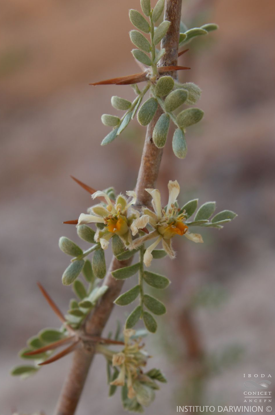Subarbusto o arbusto; tallos con (4-)5 espinas rígidas de ca. 1 cm de largo, existiendo en el punto de inserción de ellas otra pequeña ca. 1 mm de largo; entrenudos de 1-2,8 cm de largo. Hojas 3-4 yugas, de 15-30 × 10-18 mm, fasciculadas; estípulas 2, linear-lanceoladas, de 3-5 mm de largo, apenas pubescentes, rojizas, caducas; folíolos oblongos, de 6-9 × 2-4 mm, asimétricos, generalmente alternos, mucronados, con dos nervaduras prominentes en ambas caras, pubescentes. Flores con pedúnculos de 1-2 mm de largo, pubescentes; sépalos obovados, de 3-5 × 2-3 mm, desiguales, imbricados, pubescentes; pétalos cóncavos, ca. 7 × 3 mm, amarillos; estambres 10, desiguales, rojizos, filamentos subulados de 5 mm de largo, gruesos, con una escama dentiforme de 4 mm de largo, gruesa, connada en casi toda su longitud, con una convexidad en la parte superior de su cara ventral y dos expansiones aliformes laterales; la cara dorsal en su parte superior, terminada en dos pares de lacinias, casi tan largas como el filamento; anteras ovoides, de 1 mm de largo, apenas sagitadas, mucronadas; ovario ovoide, de 3 mm de largo, 5-locular, 5-alado, con una espina en el dorso de cada carpelo. Fruto carcérulo, con 5 alas triangulares, de 10-15 × 15-20 mm, con una espina dirigida hacia abajo, pubescente. Semillas 5, aplanadas, de 6 × 2 mm.