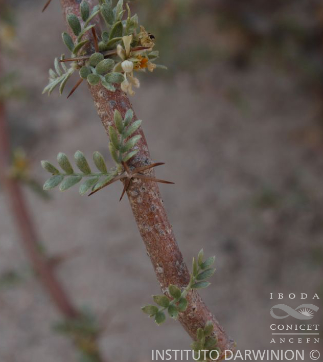 Subarbusto o arbusto; tallos con (4-)5 espinas rígidas de ca. 1 cm de largo, existiendo en el punto de inserción de ellas otra pequeña ca. 1 mm de largo; entrenudos de 1-2,8 cm de largo. Hojas 3-4 yugas, de 15-30 × 10-18 mm, fasciculadas; estípulas 2, linear-lanceoladas, de 3-5 mm de largo, apenas pubescentes, rojizas, caducas; folíolos oblongos, de 6-9 × 2-4 mm, asimétricos, generalmente alternos, mucronados, con dos nervaduras prominentes en ambas caras, pubescentes. Flores con pedúnculos de 1-2 mm de largo, pubescentes; sépalos obovados, de 3-5 × 2-3 mm, desiguales, imbricados, pubescentes; pétalos cóncavos, ca. 7 × 3 mm, amarillos; estambres 10, desiguales, rojizos, filamentos subulados de 5 mm de largo, gruesos, con una escama dentiforme de 4 mm de largo, gruesa, connada en casi toda su longitud, con una convexidad en la parte superior de su cara ventral y dos expansiones aliformes laterales; la cara dorsal en su parte superior, terminada en dos pares de lacinias, casi tan largas como el filamento; anteras ovoides, de 1 mm de largo, apenas sagitadas, mucronadas; ovario ovoide, de 3 mm de largo, 5-locular, 5-alado, con una espina en el dorso de cada carpelo. Fruto carcérulo, con 5 alas triangulares, de 10-15 × 15-20 mm, con una espina dirigida hacia abajo, pubescente. Semillas 5, aplanadas, de 6 × 2 mm.