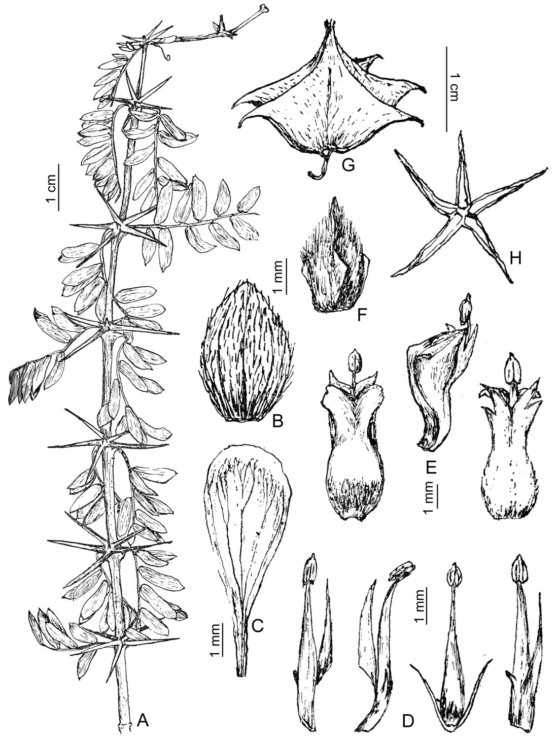 Subarbusto o arbusto; tallos con (4-)5 espinas rígidas de ca. 1 cm de largo, existiendo en el punto de inserción de ellas otra pequeña ca. 1 mm de largo; entrenudos de 1-2,8 cm de largo. Hojas 3-4 yugas, de 15-30 × 10-18 mm, fasciculadas; estípulas 2, linear-lanceoladas, de 3-5 mm de largo, apenas pubescentes, rojizas, caducas; folíolos oblongos, de 6-9 × 2-4 mm, asimétricos, generalmente alternos, mucronados, con dos nervaduras prominentes en ambas caras, pubescentes. Flores con pedúnculos de 1-2 mm de largo, pubescentes; sépalos obovados, de 3-5 × 2-3 mm, desiguales, imbricados, pubescentes; pétalos cóncavos, ca. 7 × 3 mm, amarillos; estambres 10, desiguales, rojizos, filamentos subulados de 5 mm de largo, gruesos, con una escama dentiforme de 4 mm de largo, gruesa, connada en casi toda su longitud, con una convexidad en la parte superior de su cara ventral y dos expansiones aliformes laterales; la cara dorsal en su parte superior, terminada en dos pares de lacinias, casi tan largas como el filamento; anteras ovoides, de 1 mm de largo, apenas sagitadas, mucronadas; ovario ovoide, de 3 mm de largo, 5-locular, 5-alado, con una espina en el dorso de cada carpelo. Fruto carcérulo, con 5 alas triangulares, de 10-15 × 15-20 mm, con una espina dirigida hacia abajo, pubescente. Semillas 5, aplanadas, de 6 × 2 mm.