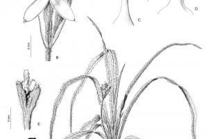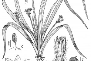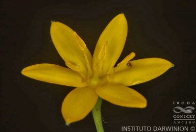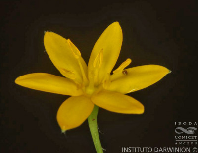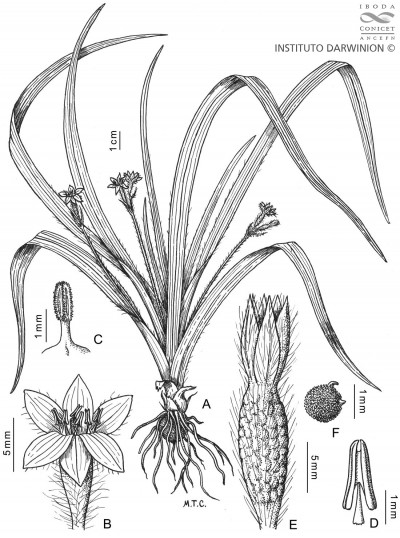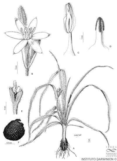 Hierba perenne, de 7-20 cm de alto, de cormo ± tuberiforme, ca. 1-3 cm × 1-2,5 mm, con raíces ± carnoso-fibrosas, rodeado a veces por fibrillas remanentes de las hojas basales. Hojas numerosas, envainadoras, rosuladas, alrededor de 6-35 × 0,5-1,3 cm, linear-subuladas, atenuadas hacia el ápice, extendidas o flexuosas, de dorso aquillado, atenuadas hacia el ápice con pelos sedosos, ralos o raras veces casi glabras. Inflorescencias umbeliformes, 2-3 (-4)-floros o flores solitarias; raquis marcadamente piloso, con 2 brácteas lineares en cada nudo floral, escapos de 10-20 cm de largo. Flores de 6-15 mm de diám., pedicelos hasta 2 cm de largo, pilosos. Tépalos oblongo-lanceolados, ca. 4-9 × 1,3-3 mm, los externos, amarillo verdosos, pilosos en la cara abaxial, los internos amarillos escasamente pilosos o glabros. Estambres subiguales, los opuestos a los tépalos externos ligeramente más largos que los opuestos a los tépalos internos, anteras de 3 mm de largo, sagitadas, basifijas, versátiles, con conectivo ancho, tecas separadas entre sí en los dos extremos, filamentos libres, unidos entre sí solo en la base. Ovario subclaviforme, no rostrado, de 3,4-5,5 × 1,2-1,5 mm, pubescente; estilo 2,5-4 mm de largo, estigma inconspicuo, papiloso. Cápsulas subglobosas o cilíndricas, triquetras, ca. 0,6-1,3 × 2,5-3,7 mm, superficie verrucosa granulosa, coronadas por los tépalos, caducos a la dehiscencia. Semillas muy pequeñas, de 1-1,2 mm de largo, subglobosas, negras, granulosas, apiculadas, con resto del hilo.