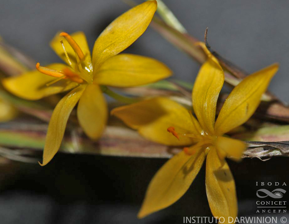 Plantas de 30-170 cm de altura. Rizoma compacto oblicuamente ramificado, de 10-12 mm de grosor, con muchas raíces carnoso-fibrosas. Hojas basales de 28-250 cm, lineares o linear-ensiformes, coriáceas. Tallo floral escapiforme, alado-ancipitado, tan largo como las hojas mayores. Ripidios varios, paucifloros, brácteas subiguales de 1,8-2,4 cm de largo. Flores amarillas, de 1,5-2 cm de diám., rotáceas; pedicelos filiformes, glabros. Tépalos espatulados de 7-9 × 2-3 mm, agudos, cuneados o cuspidados, extendidos desde la base. Estambres con anteras oblongo-lineares, algo sagitadas en la base, de 3-4,2 mm de largo, incurvas después de la dehiscencia, con filamentos soldados en la base ca. 1,5 mm, parte libre filiforme. Ovario obovoide-claviforme, de 2,2 mm de largo y 1,8 mm lat. Estilo con ramas extendidas oblicuamente, de 3,5-4 mm de largo. Cápsulas turbinado-globosas o casi globosas, de 6-10 mm de ancho. Semillas negras, de 2-2,4 mm de ancho. Subsp. palmifolium.- De hojas y tallos glaucos, de 11-15 mm de ancho.